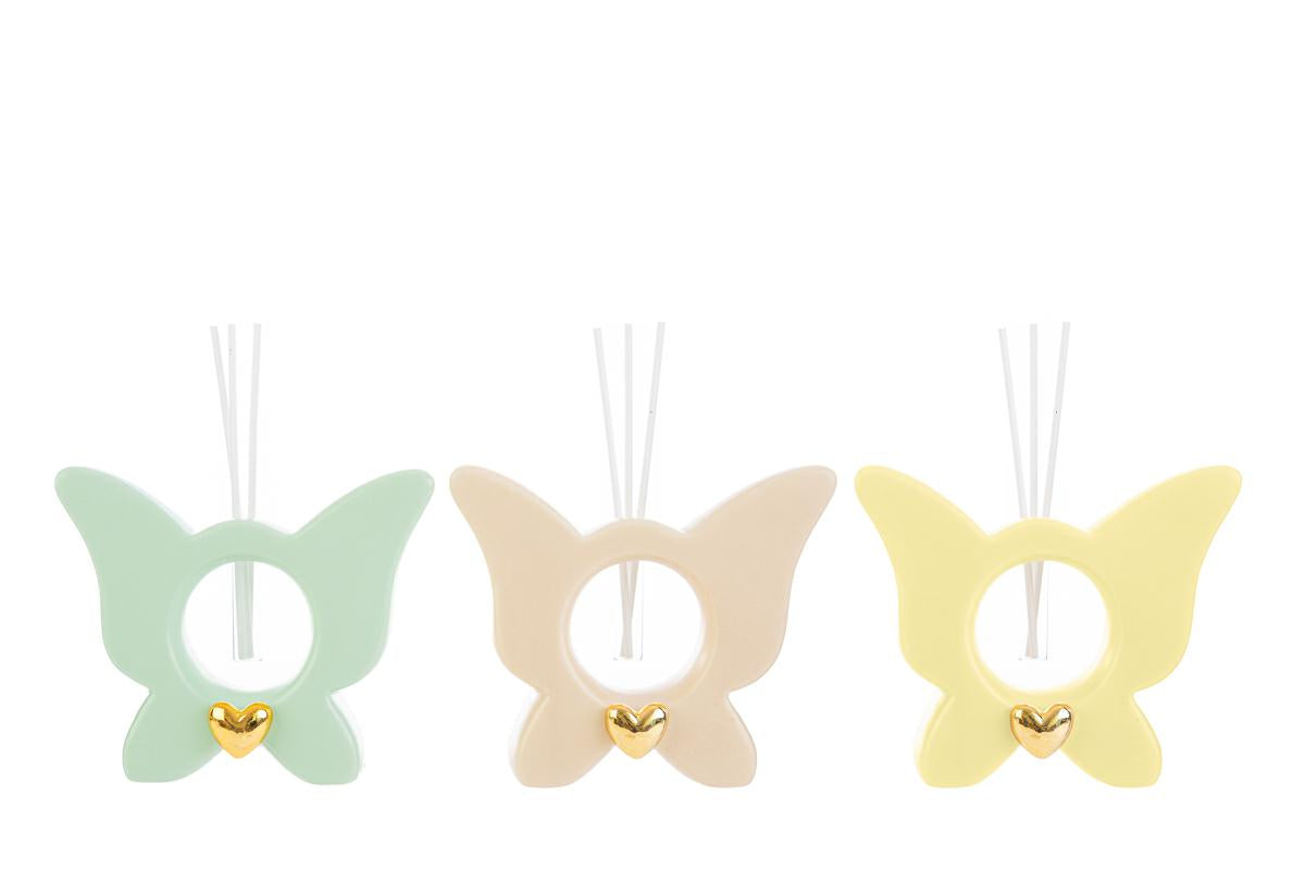 Profumatore farfalla, in porcellana disponibile in 3 colori dai toni pastello assortiti, con cuoricino dorato.