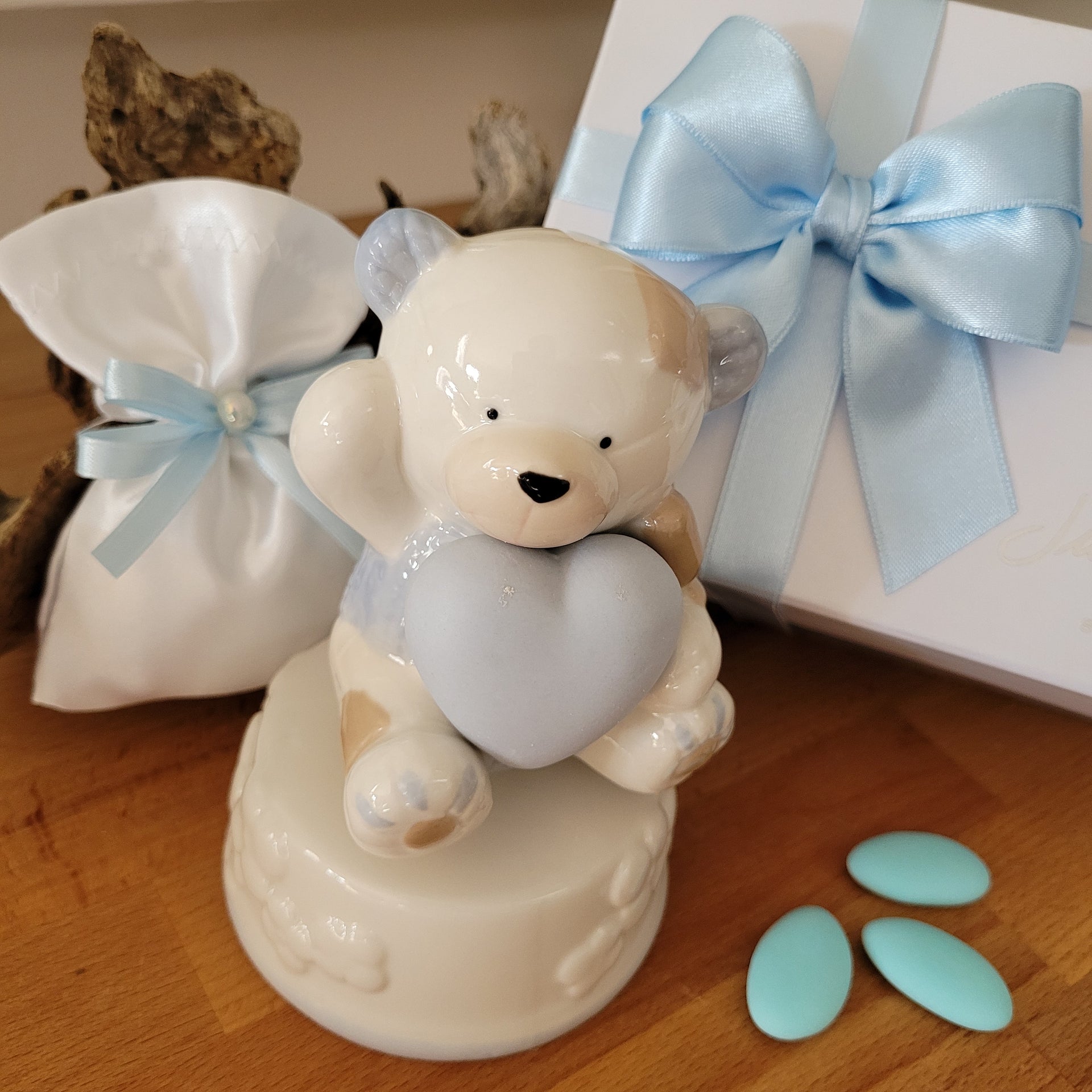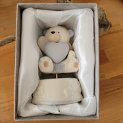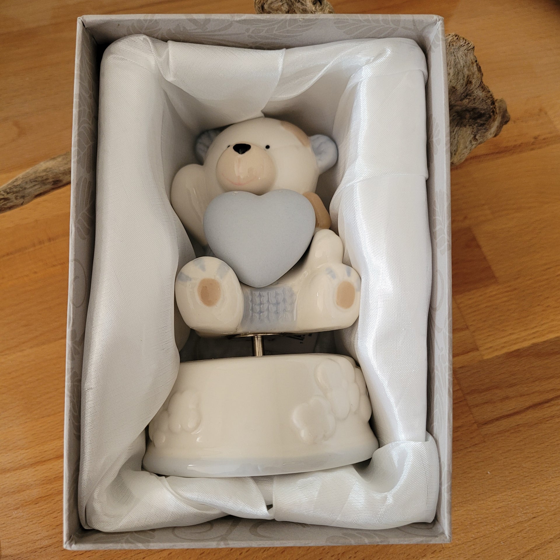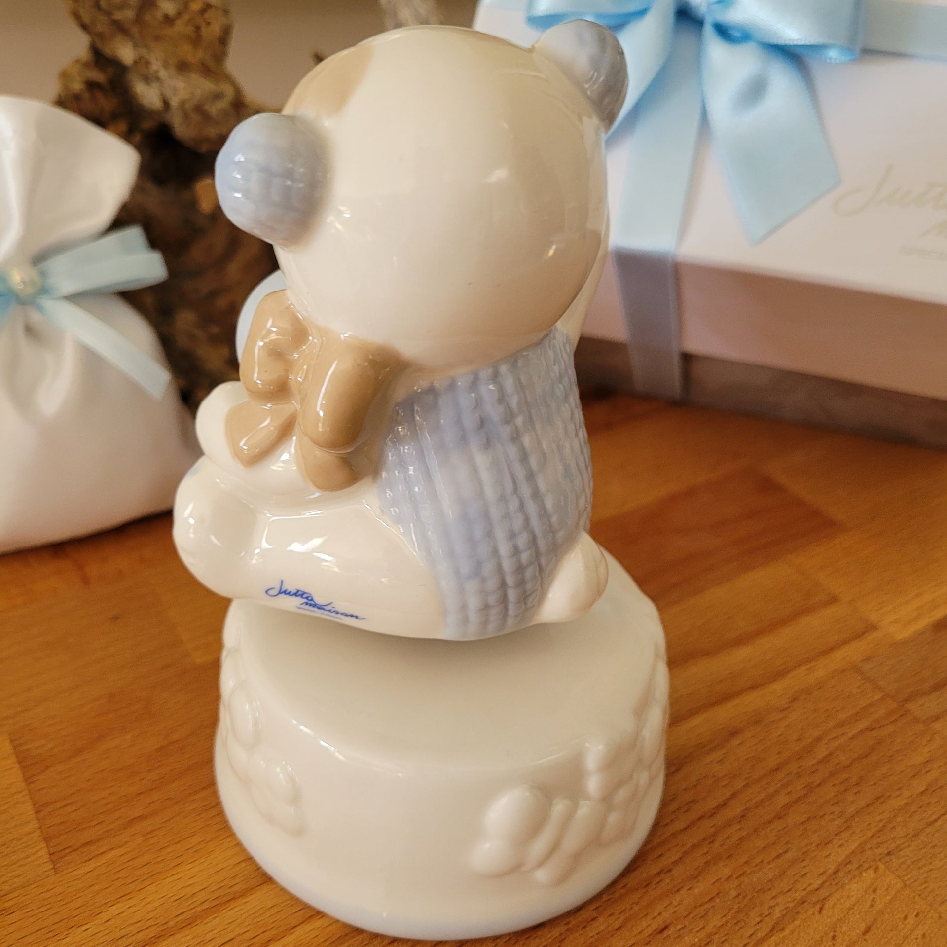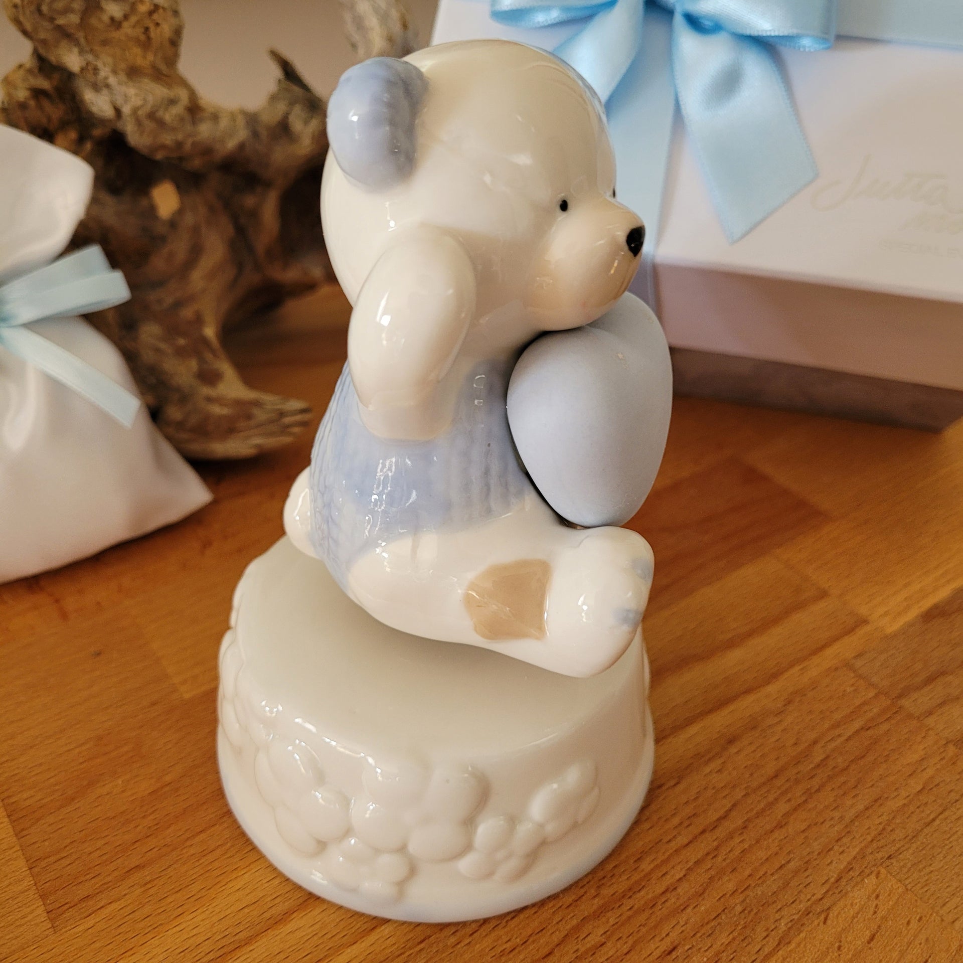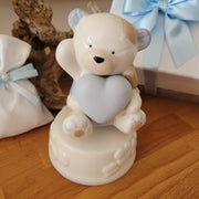 Carillon Orsetto con cuore, in finissima porcellana nei toni del bianco panna e azzurra.