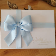 - Scatola o shopper decorati con nastri in doppio raso e fiocco.