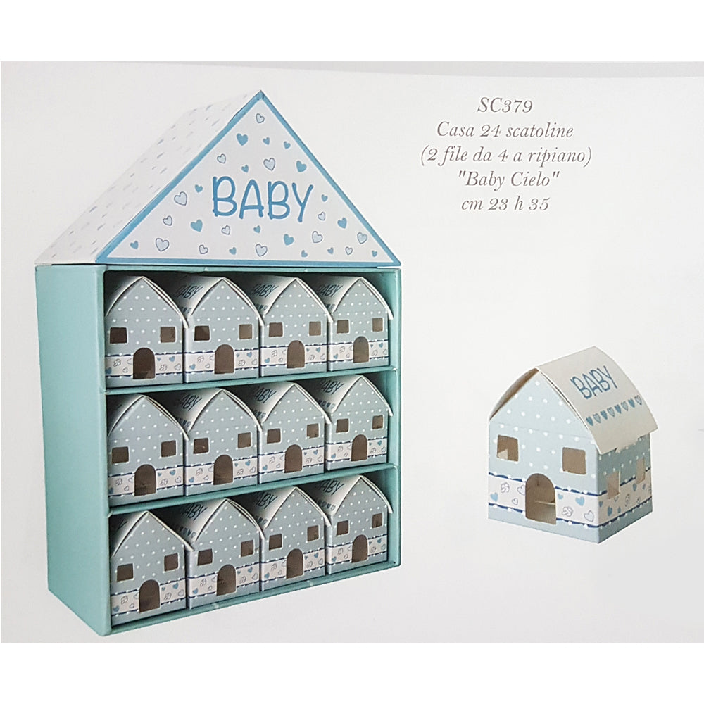 La casetta grande contiene 24 scatoline-casetta in cartoncino con scritta Baby, misura cm 5x5x7.