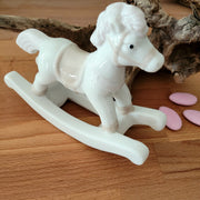 Cavallo a dondolo, in finissima porcellana nei toni del bianco panna, rosa e beige.