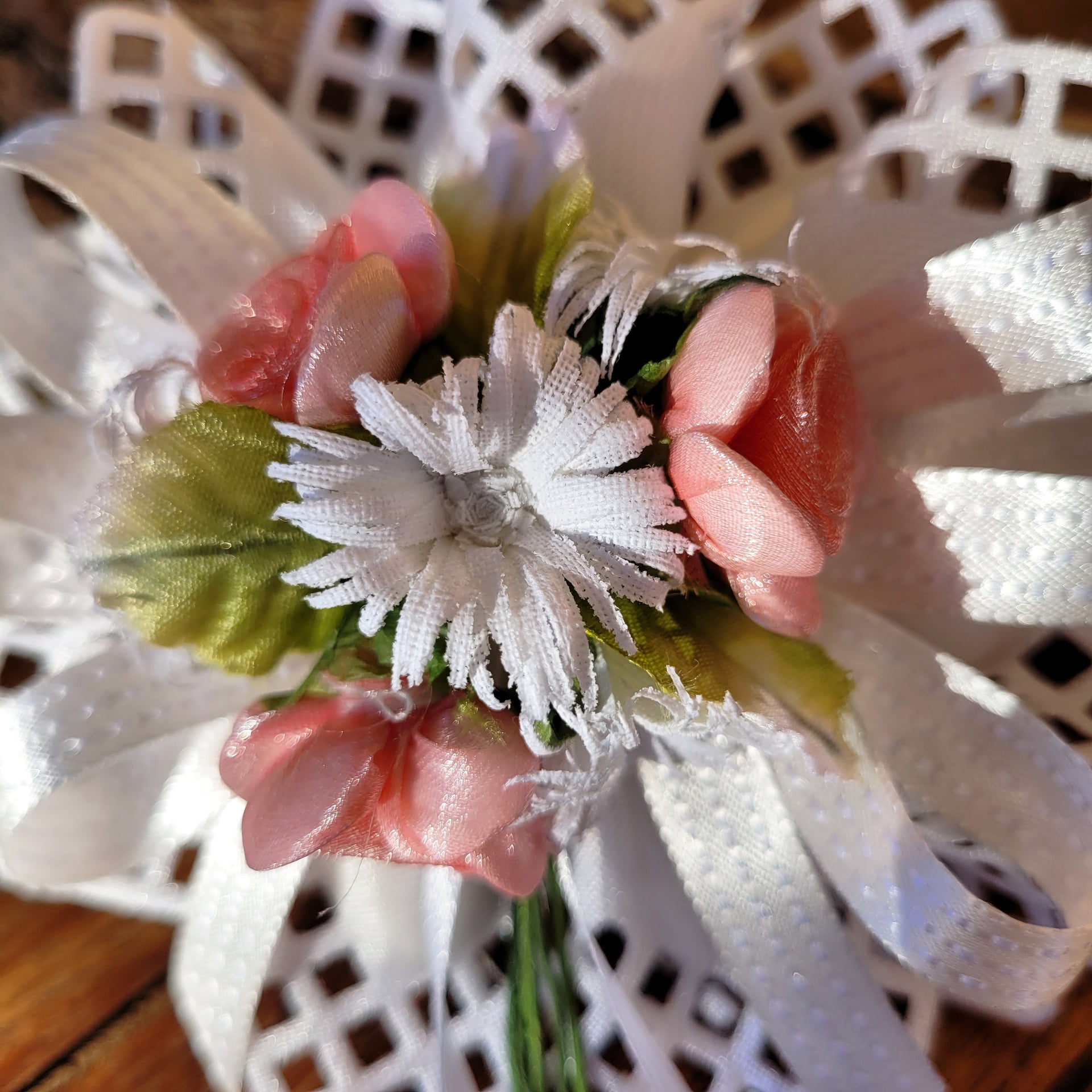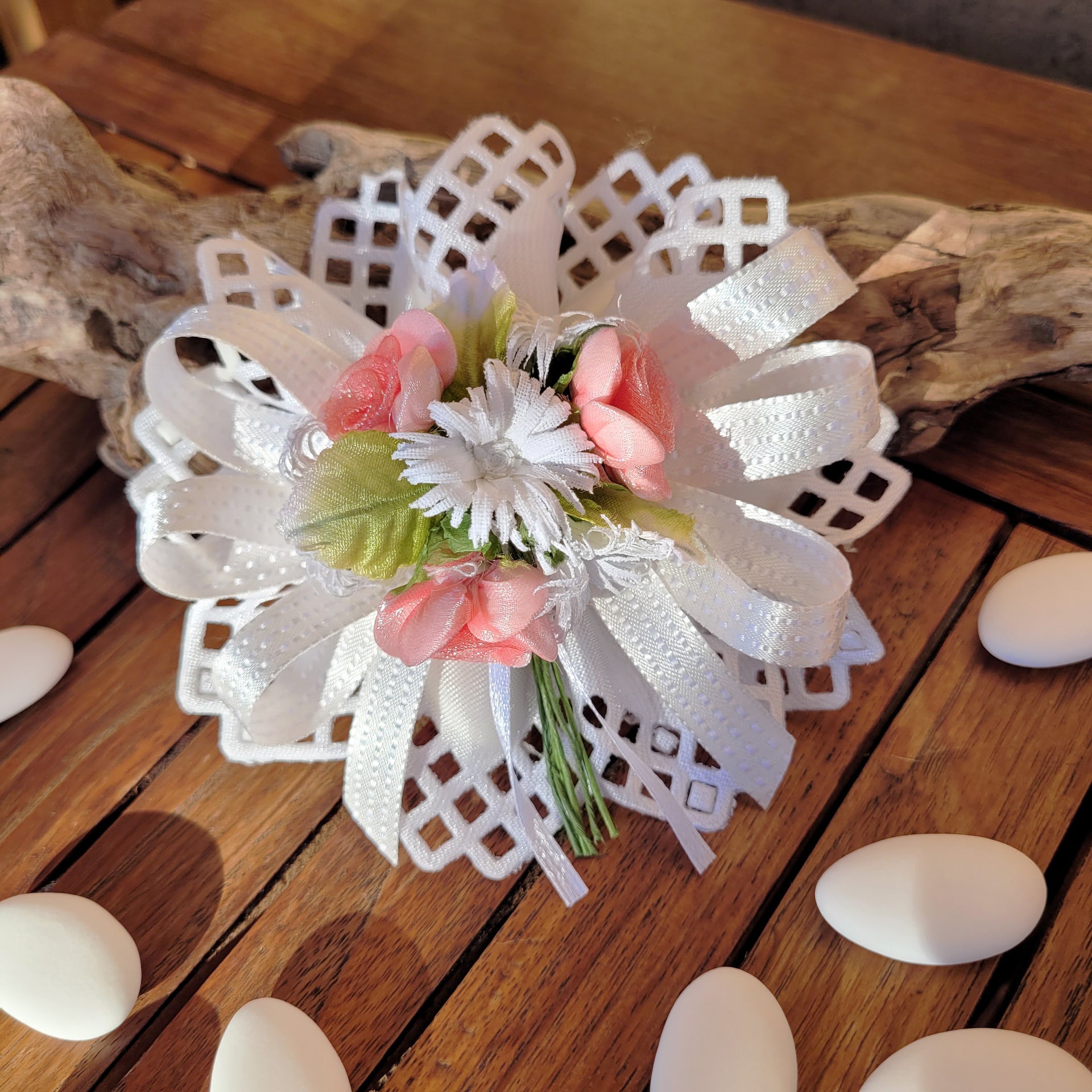Coccarda porta confetti in canetè di colore bianco decorata con nastrini in doppio raso e fiori rosa e bianchi.