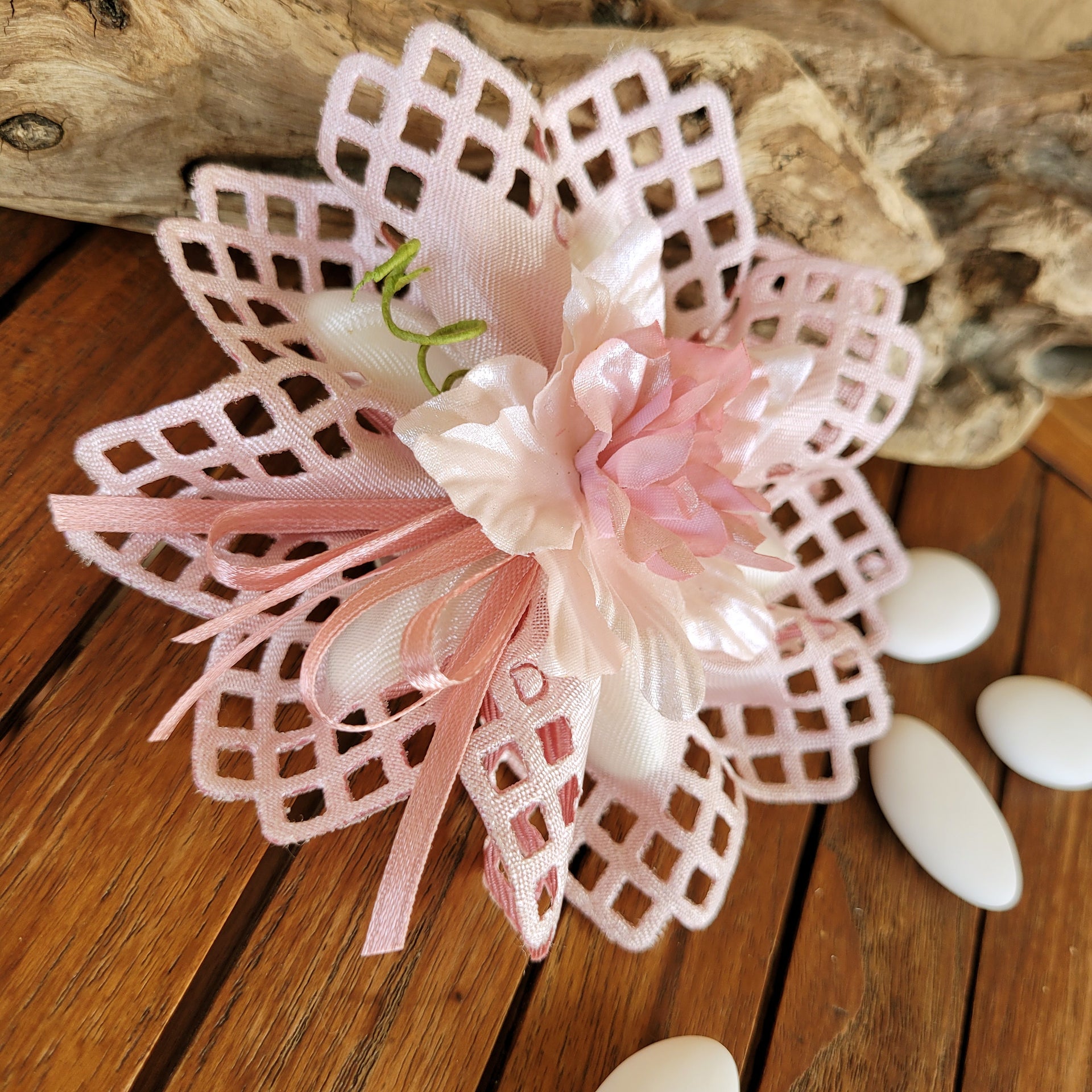 Coccarda porta confetti Camilla, in canetè color rosa antico.