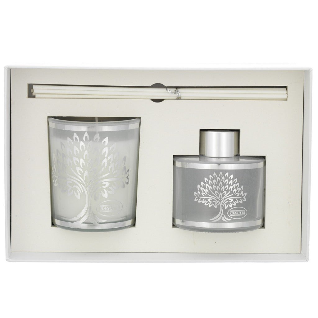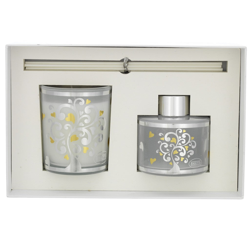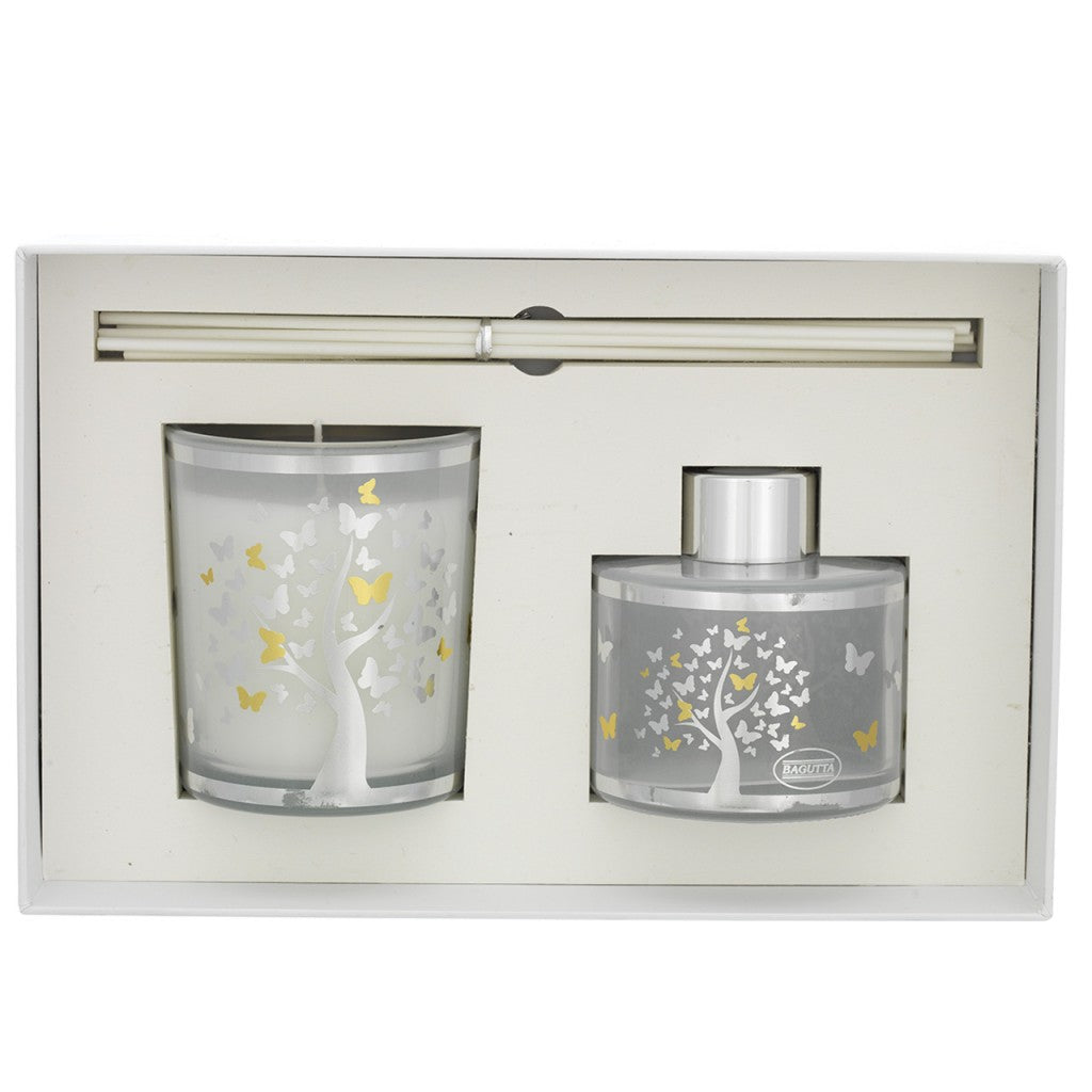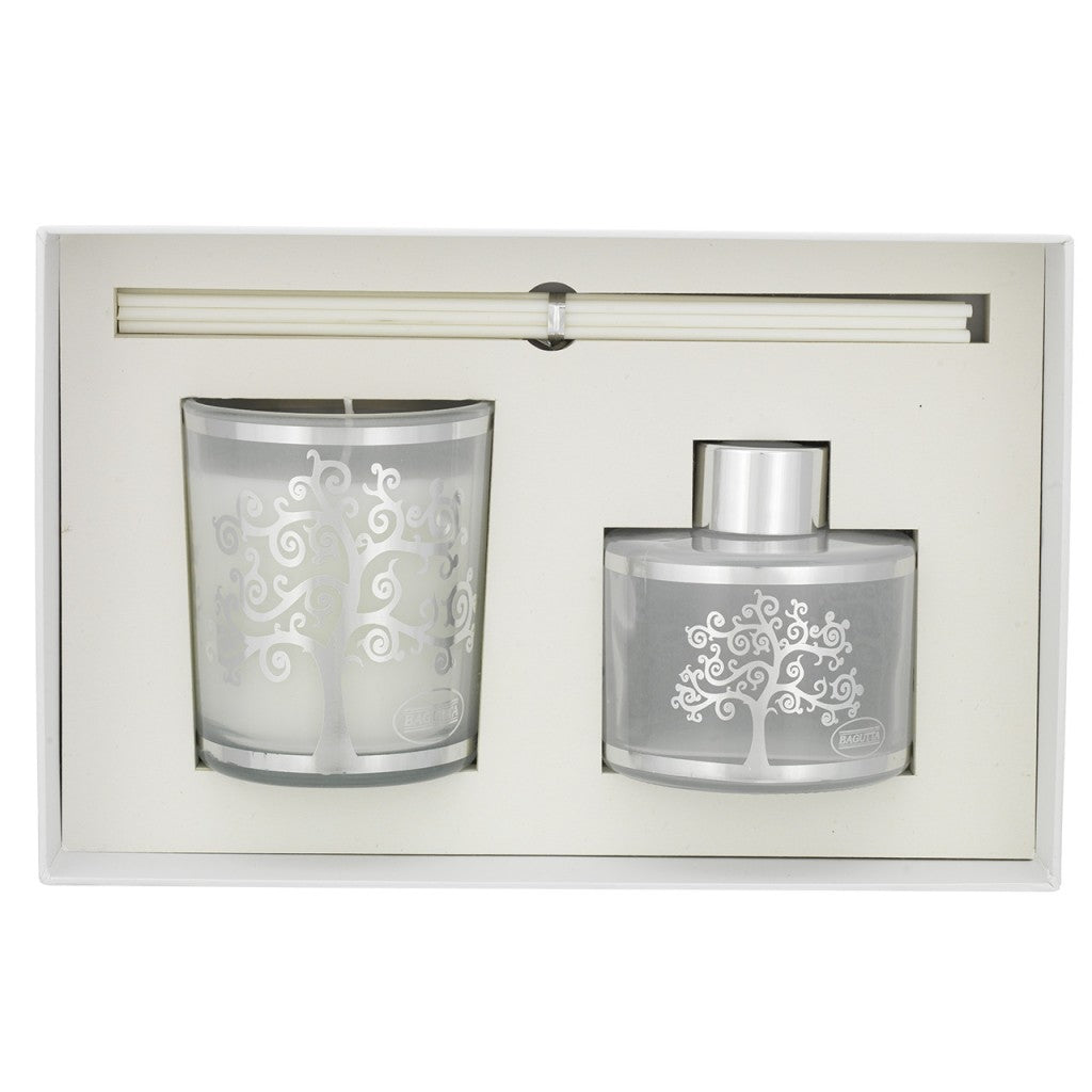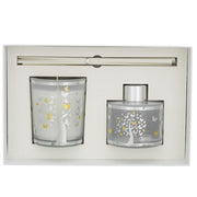 Cofanetto coordinato contenente un flacone di profumatore e una candela aromatizzata.