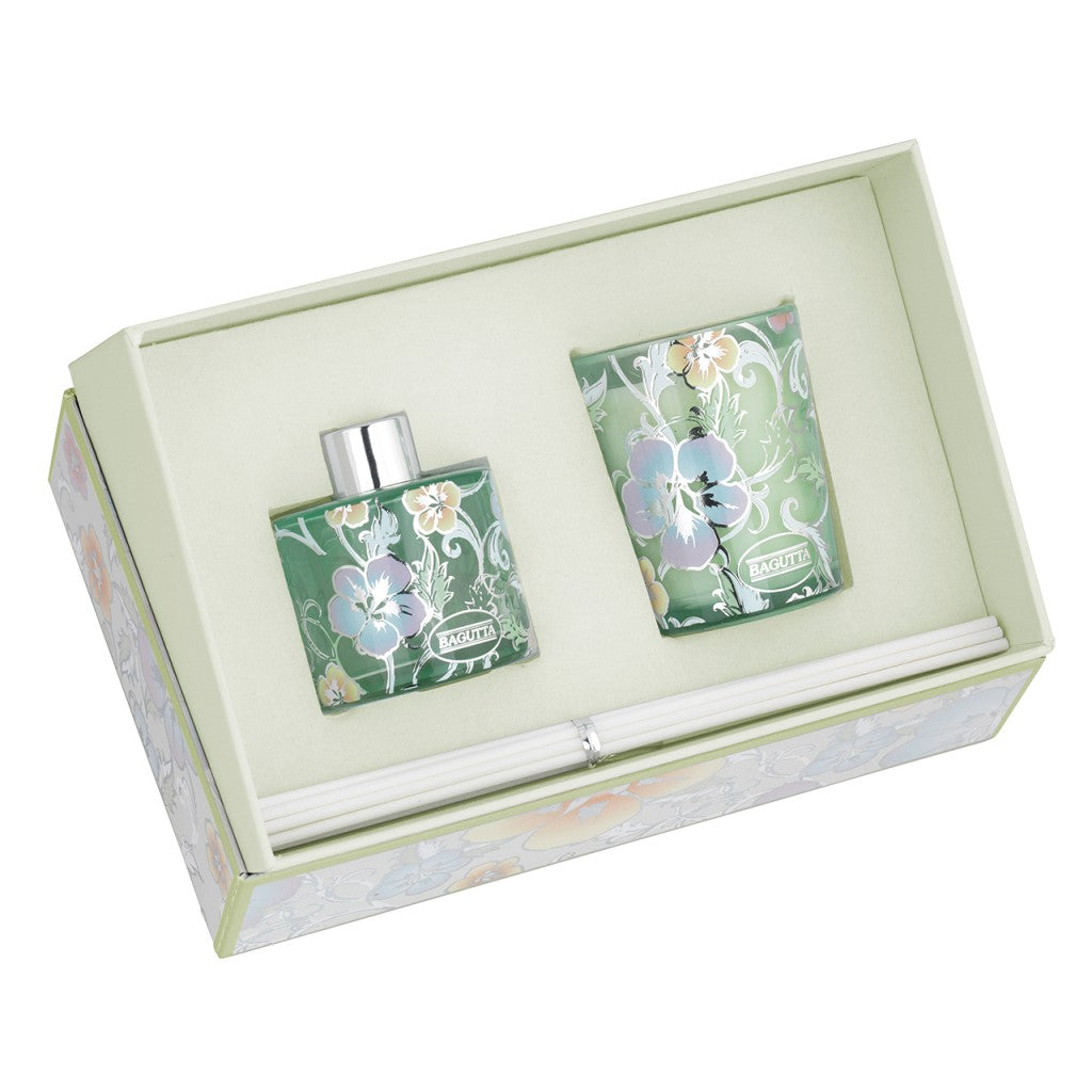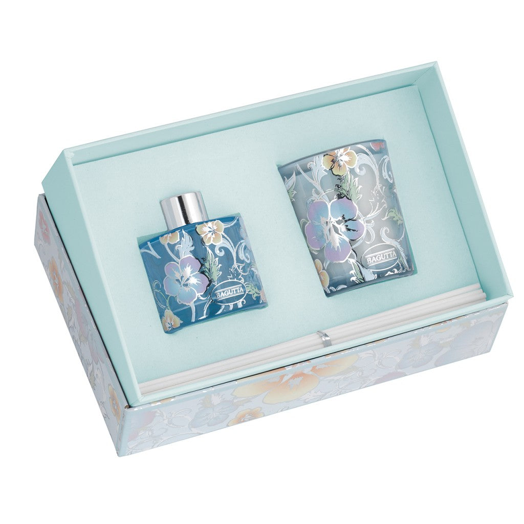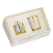 Cofanetto coordinato contenente un flacone di profumatore da 50 ml e una candela aromatizzata da 70 grammi.