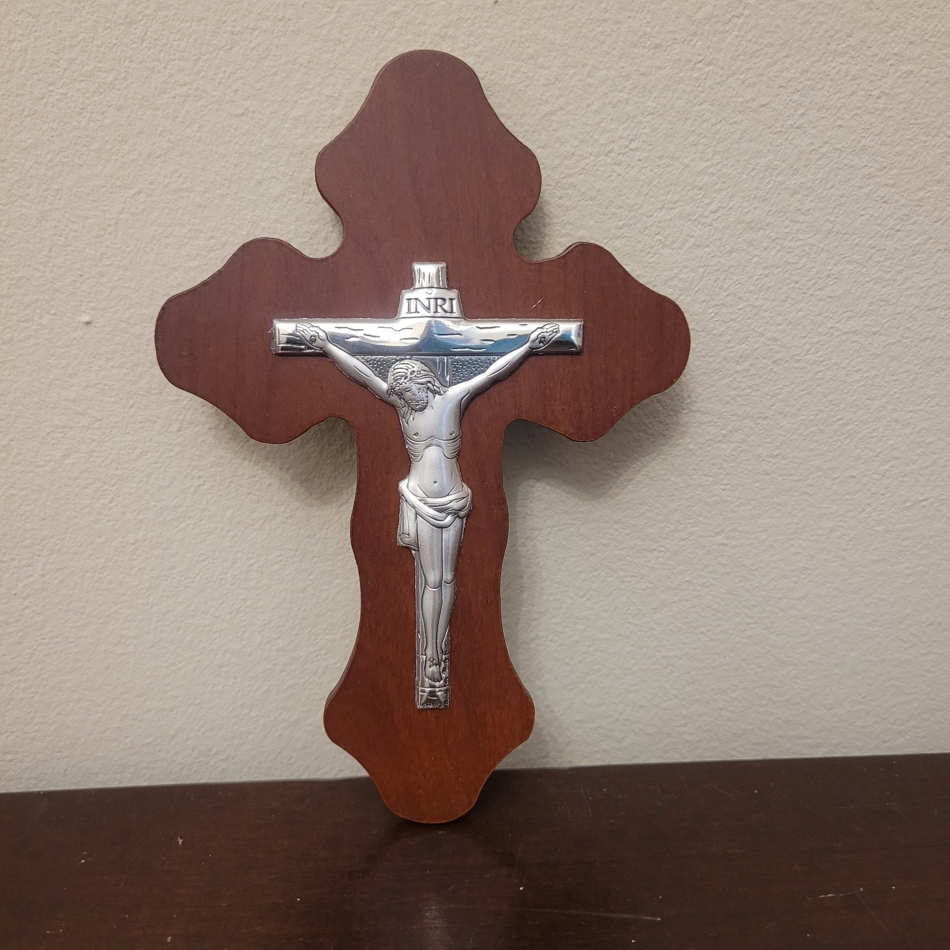 Piccolo crocifisso in argento, con retro in legno, da appendere.