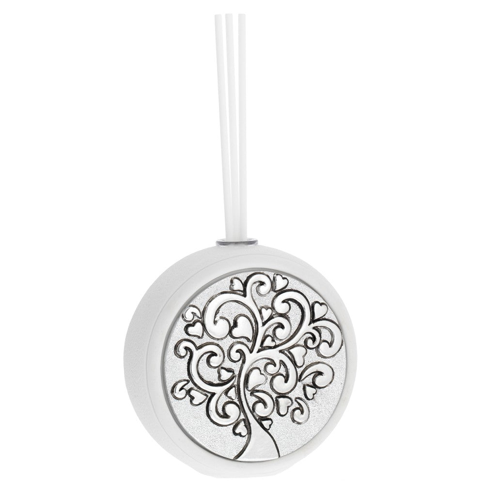 Profumatore per ambiente tondo con albero della vita argentato a riccioli.
