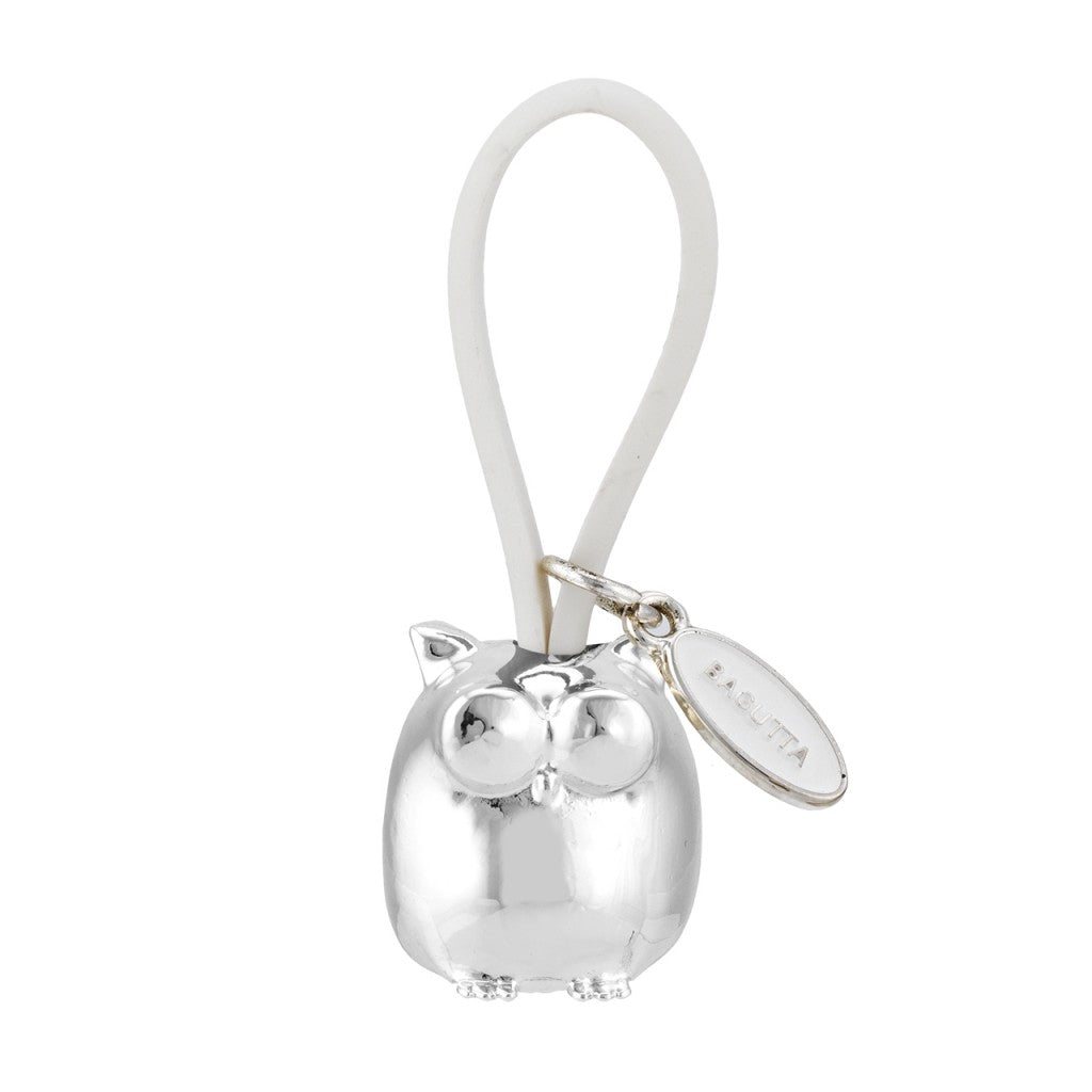 Portachiavi Bagutta con gufetto argentato e cordoncino in silicone.