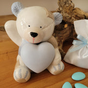 Orsetto con cuore, in finissima porcellana nei toni del bianco panna e azzurro.