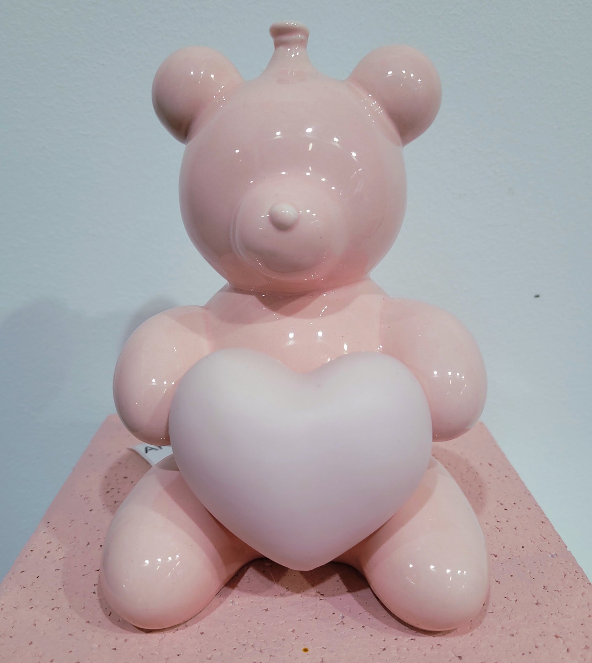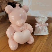 Orsetto salvadanaio in finissima porcellana rosa lucida che abbraccia un grande cuore satinato.