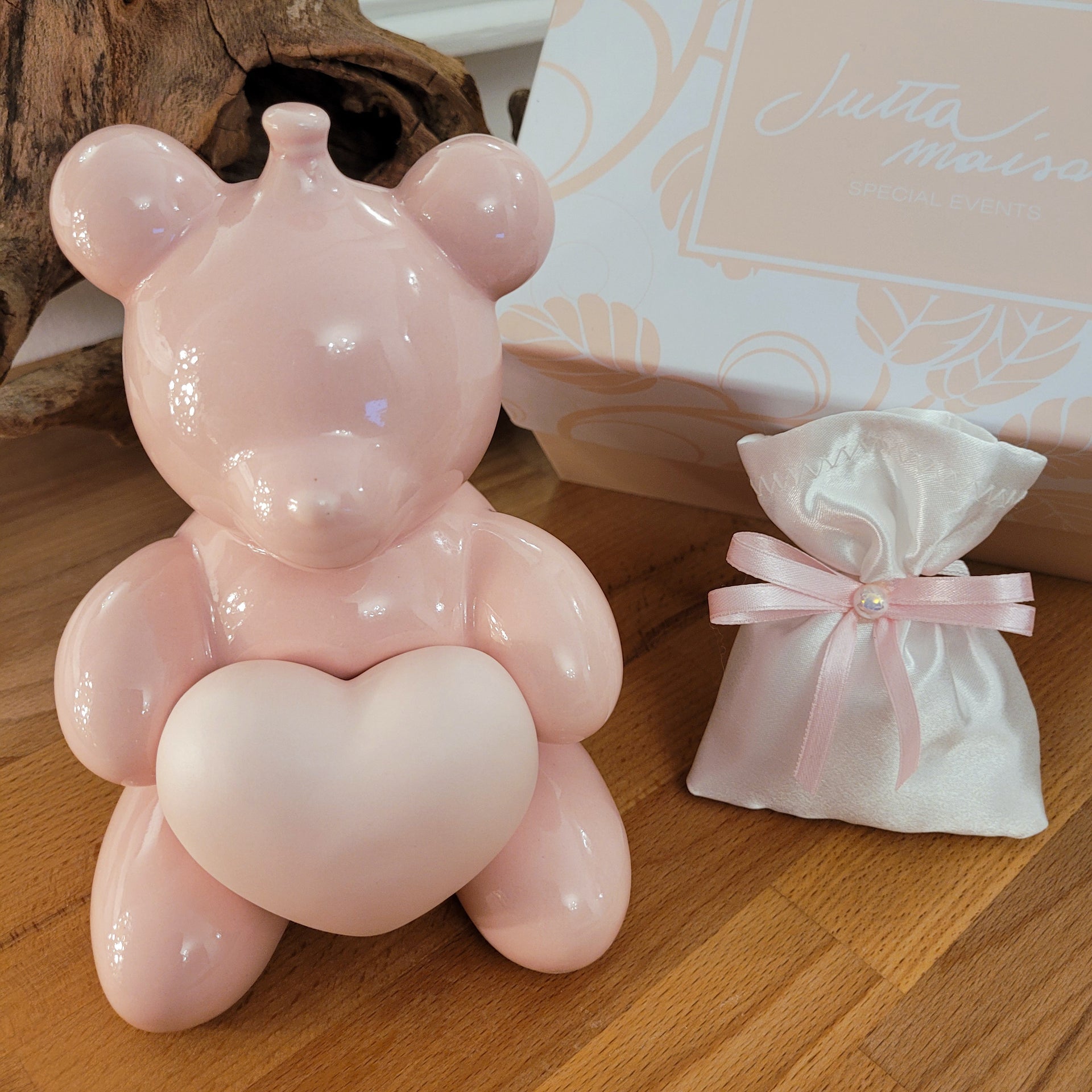 Orso salvadanaio in porcellana rosa lucida con cuore satinato