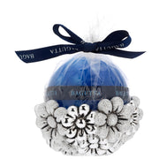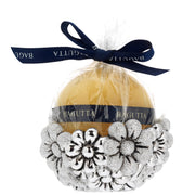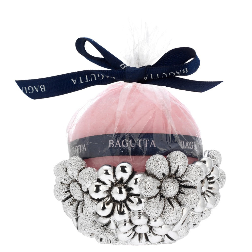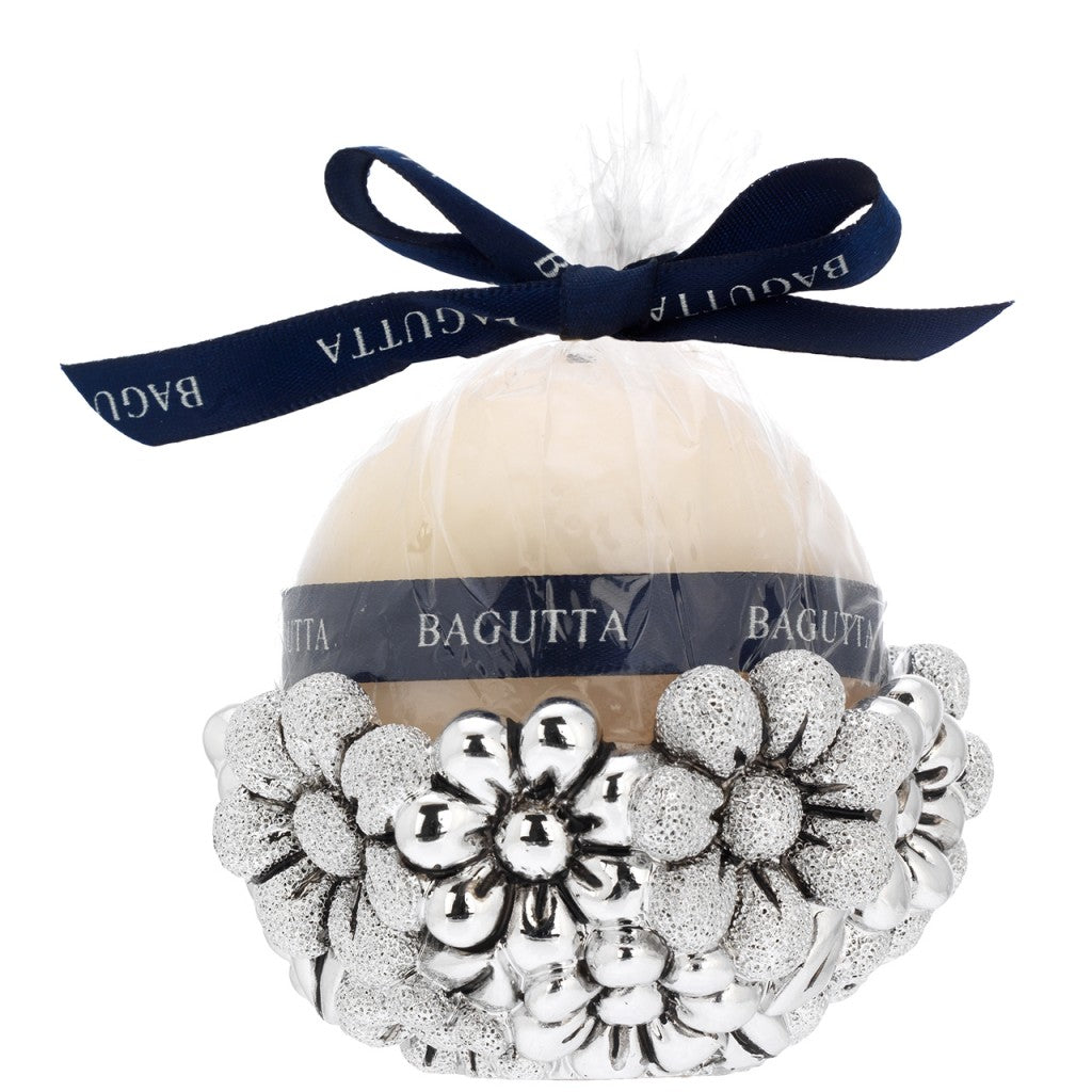 Porta candela tondo argentato con margherite e candela sfera disponibile in due misure e 4 colori.