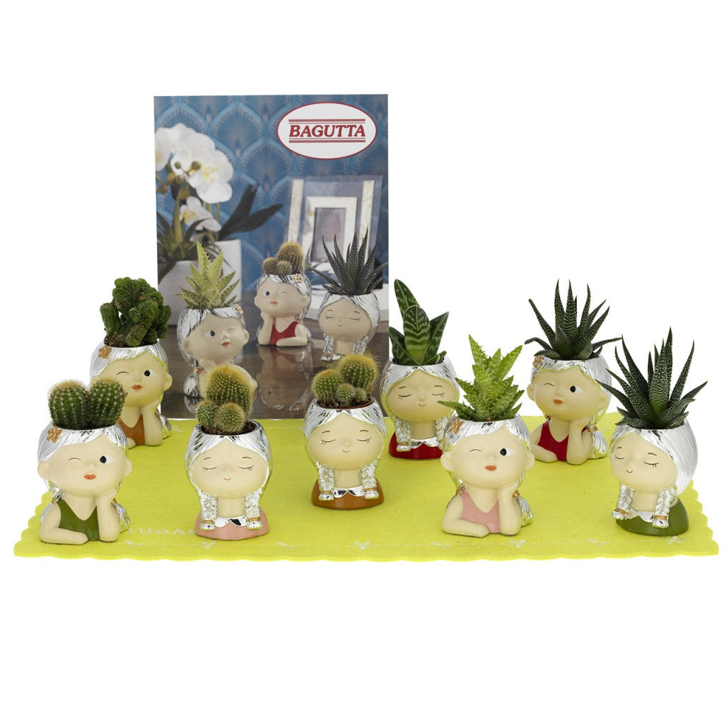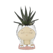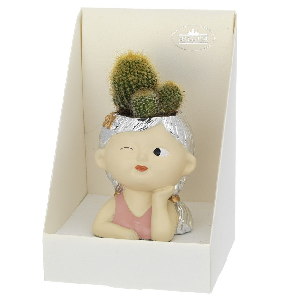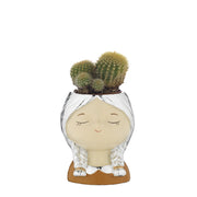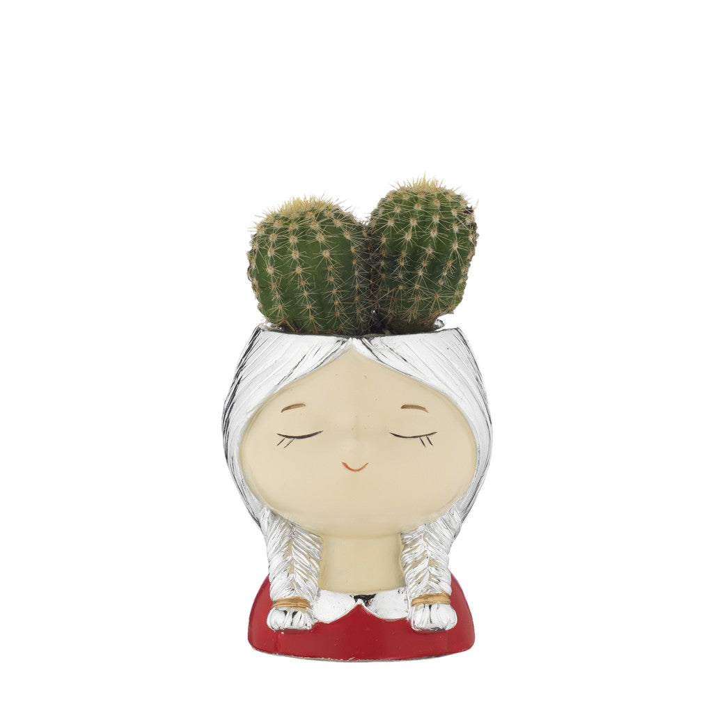 Porta vasetto in resina con particolari argentati a forma di simpatico visetto con treccine.