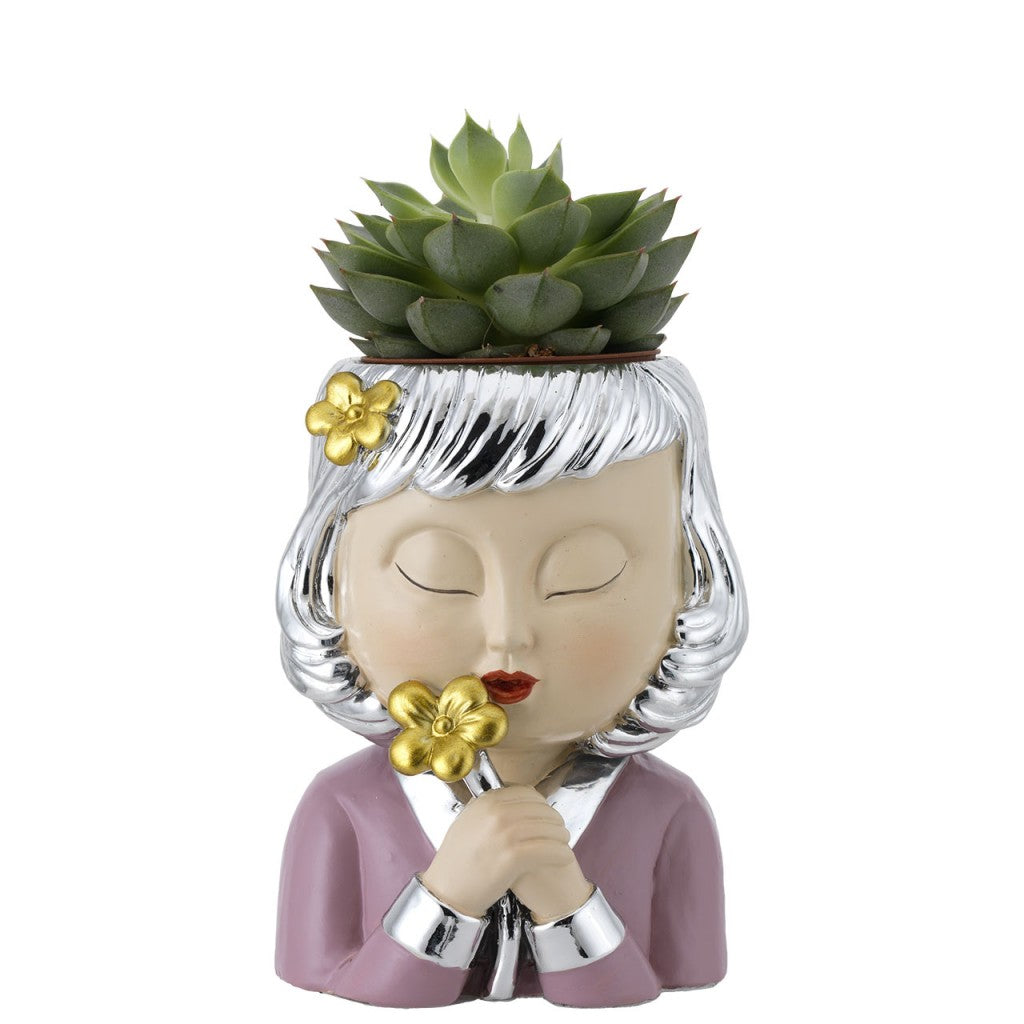 Porta vasetto in resina con particolari argentati a forma di viso di donna con fiore.