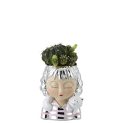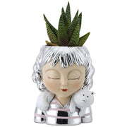 Porta vasetto in resina con particolari argentati a forma di viso di donna con gattino bianco.