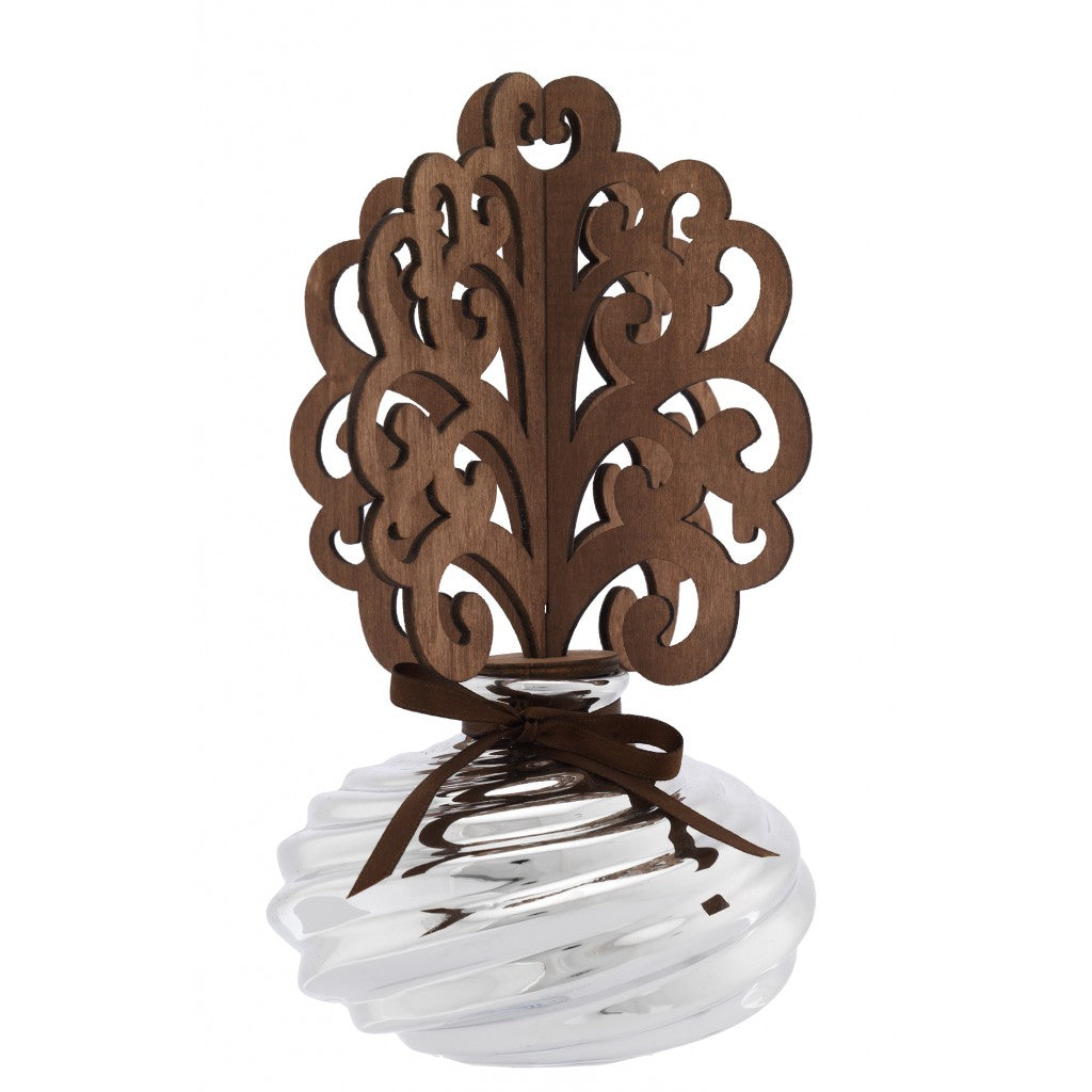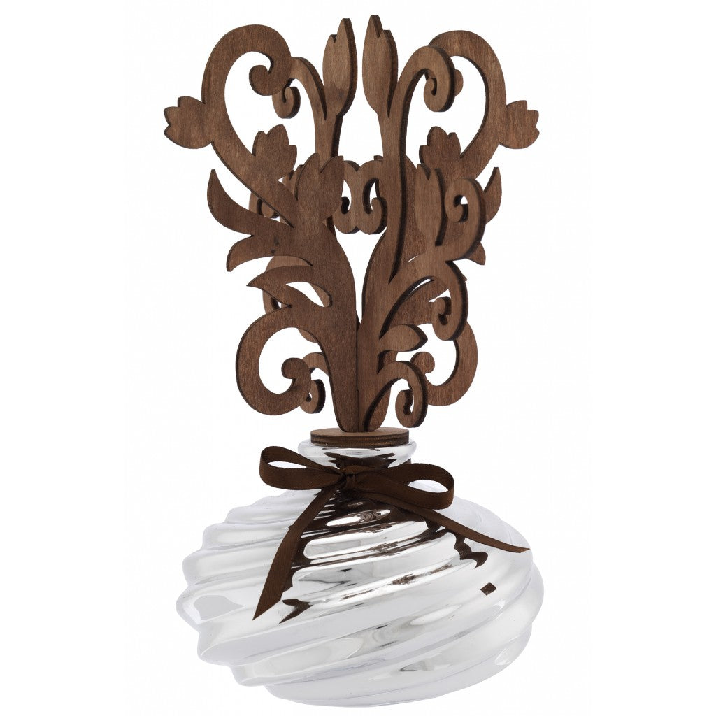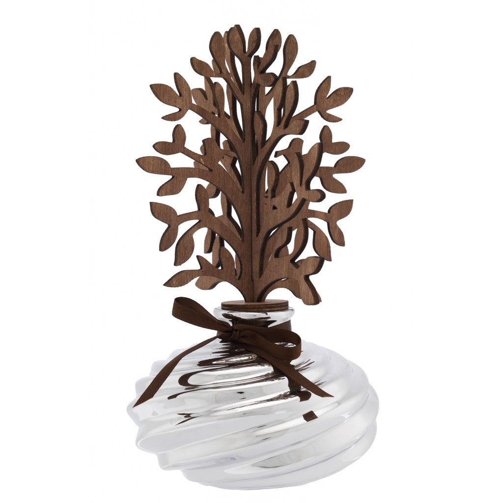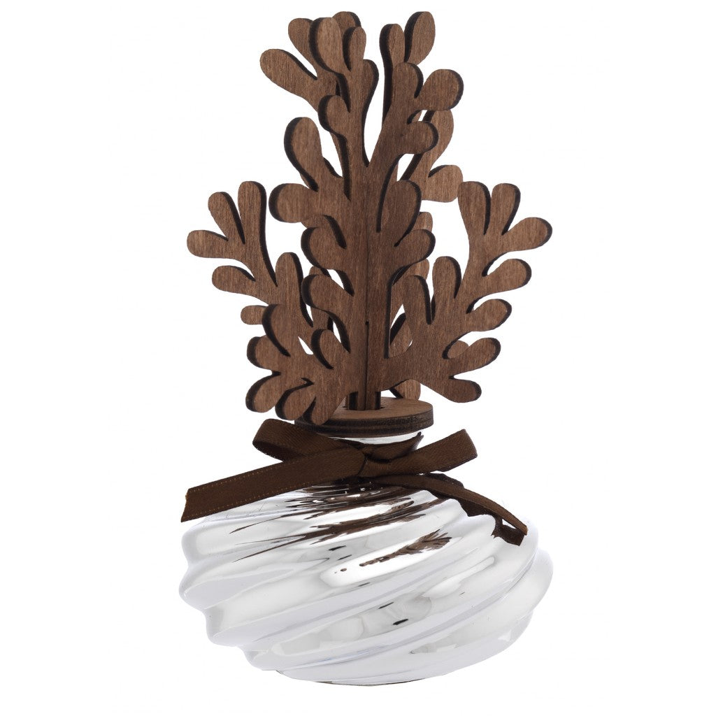 Profumatore in porcellana argentata lavorazione torciglione con diffusore a forma di albero stilizzato, in legno.