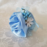 Rosa porta confetti in raso azzurro decorata con nastrini in organza a pois, fiorellino e bacche.
