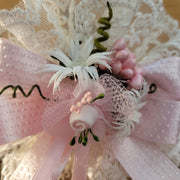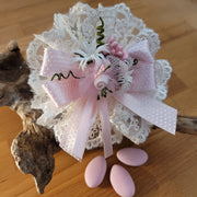 Il porta confetti è decorato con nastri in raso rosa impunturato bianco e mazzolino fiorito.