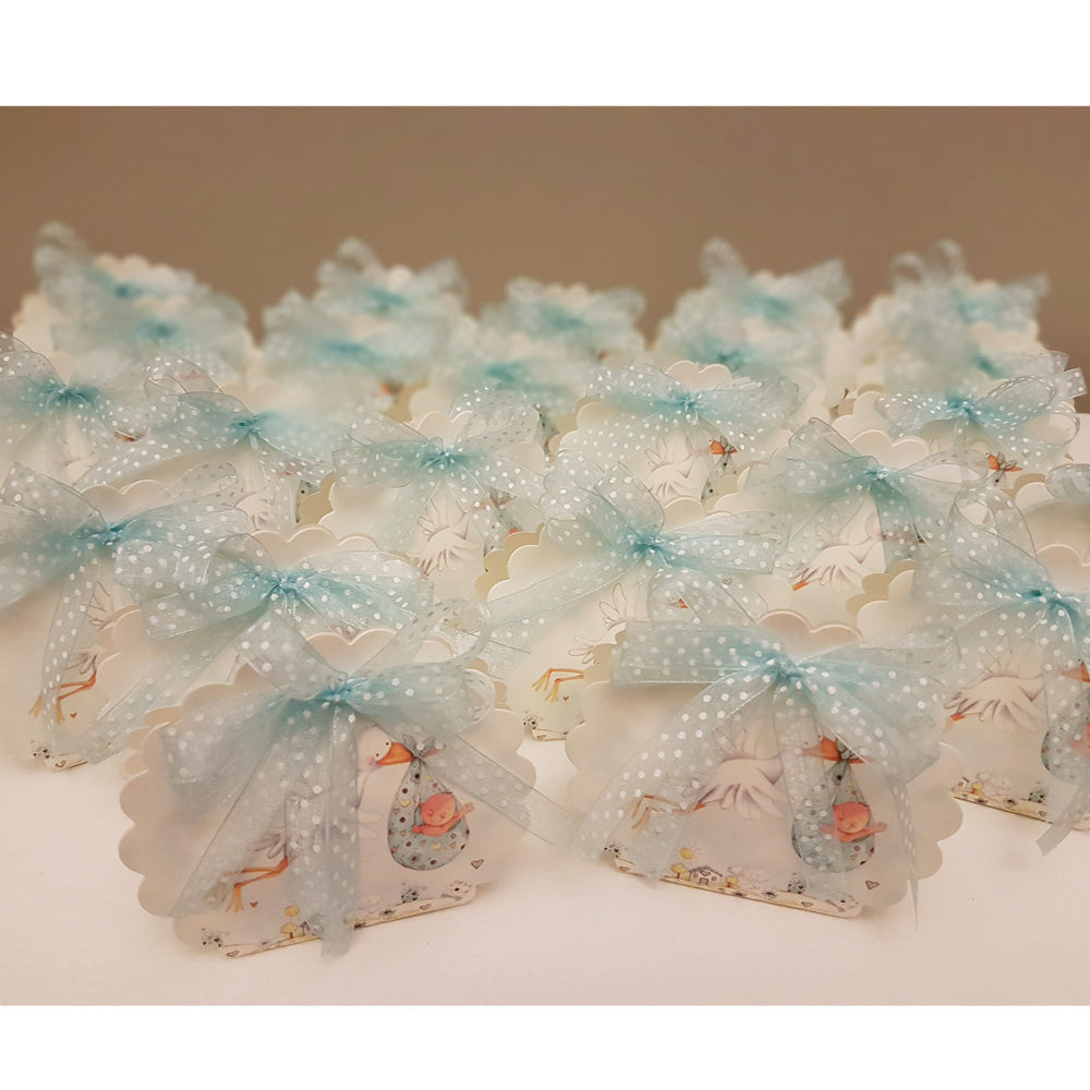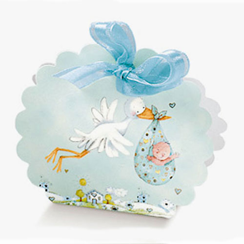 Scatolina portaconfetti cicogna azzurra per nascita e battesimo bambino
