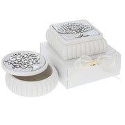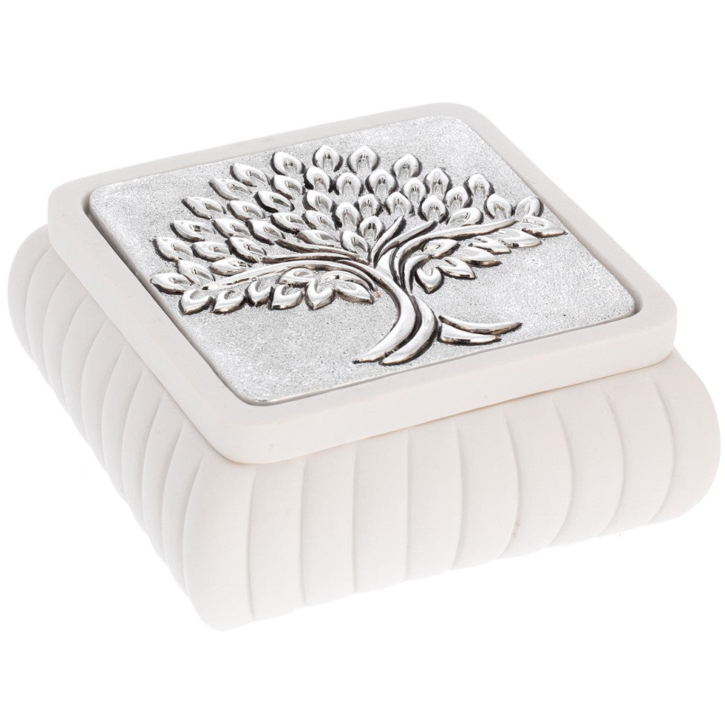 Scatolina quadrata in resina bianca a festoni con coperchio argentato.