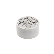 Scatolina tonda in resina con decorazione sul coperchio di albero della vita argentato.