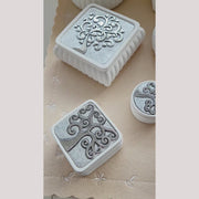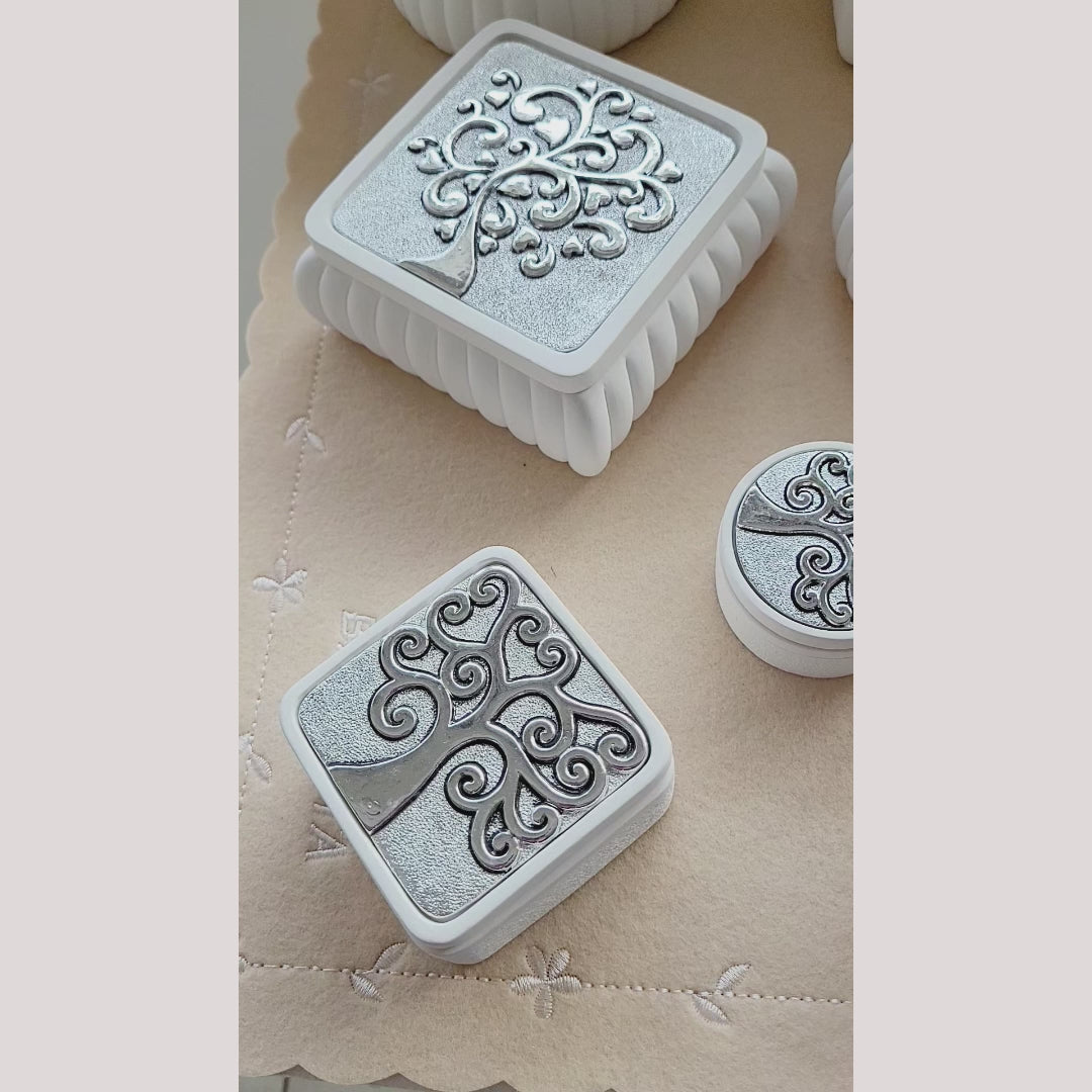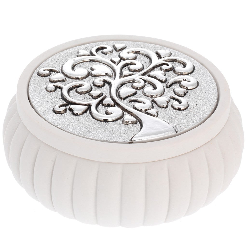 Scatolina tonda in resina bianca a festoni con coperchio argentato.