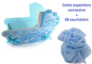 STOCK OFFERTA: 48 Sacchettini azzurri in georgette con cesto espositore carrozzina