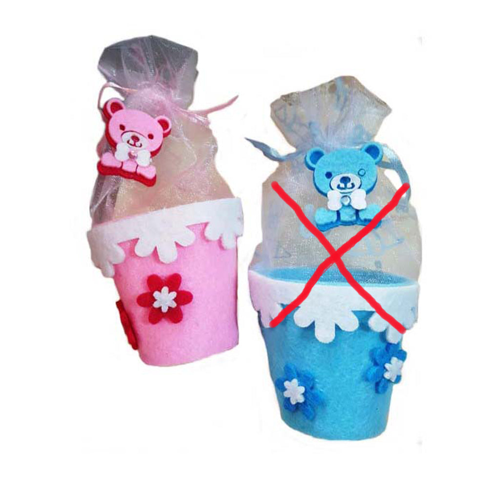 60 sacchettini porta confetti in panno rosa a forma di secchiello con parte superiore in organza con tirante.