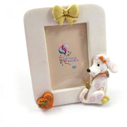 Cornice porta fotografia in resina decorata a mano con cagnolino a pois rosa.