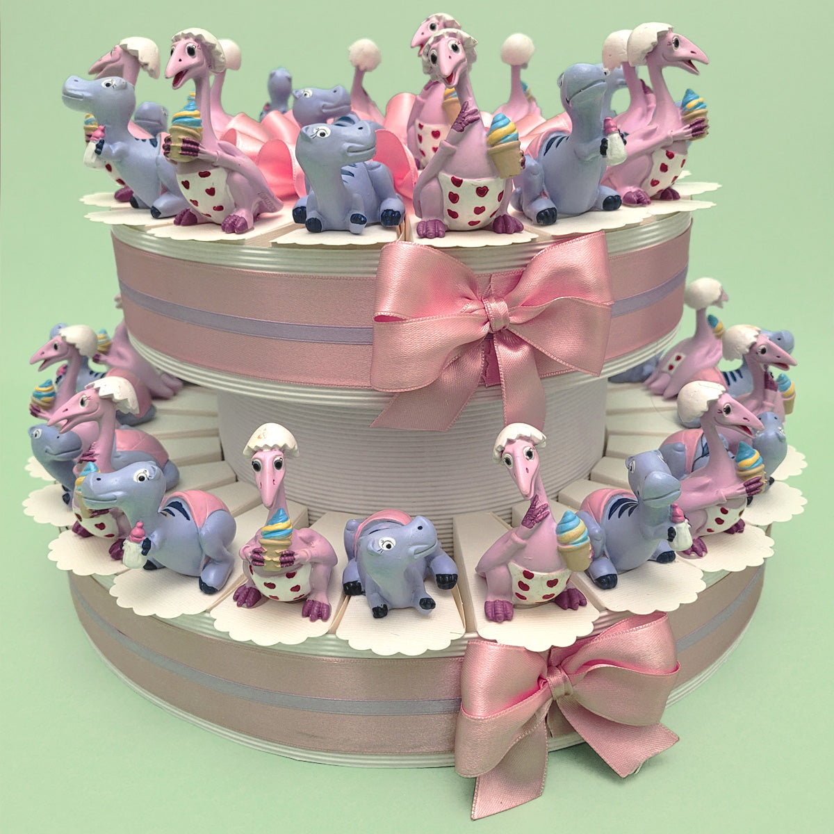 La bomboniera che decora ogni fettina è un dolcissimo dinosauro cucciolo, presente in due colori e in due modelli assortiti.