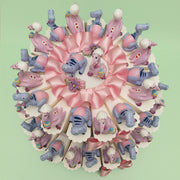 Torta di bomboniere composta da 40 scatoline in cartoncino bianco, decorata con nastri in doppio raso rosa e lilla.