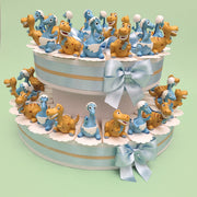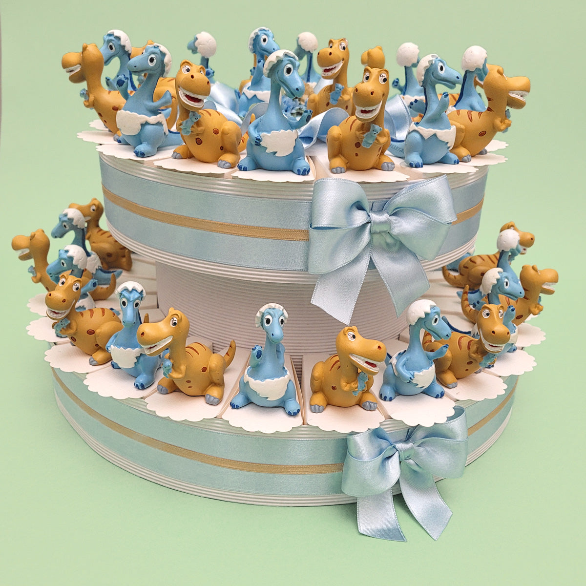 La bomboniera che decora ogni fettina è un dolcissimo dinosauro cucciolo, presente in due colori e in due modelli assortiti.