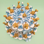 Torta di bomboniere composta da 40 scatoline in cartoncino bianco, decorata con nastri in doppio raso azzurro e ocra.