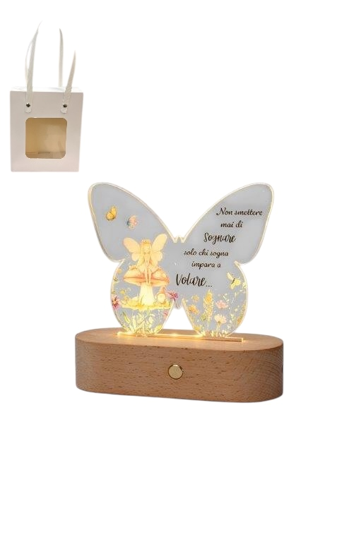 Sogni di Luce: lampada LED in legno con plexi farfalla con fatina e funghetto