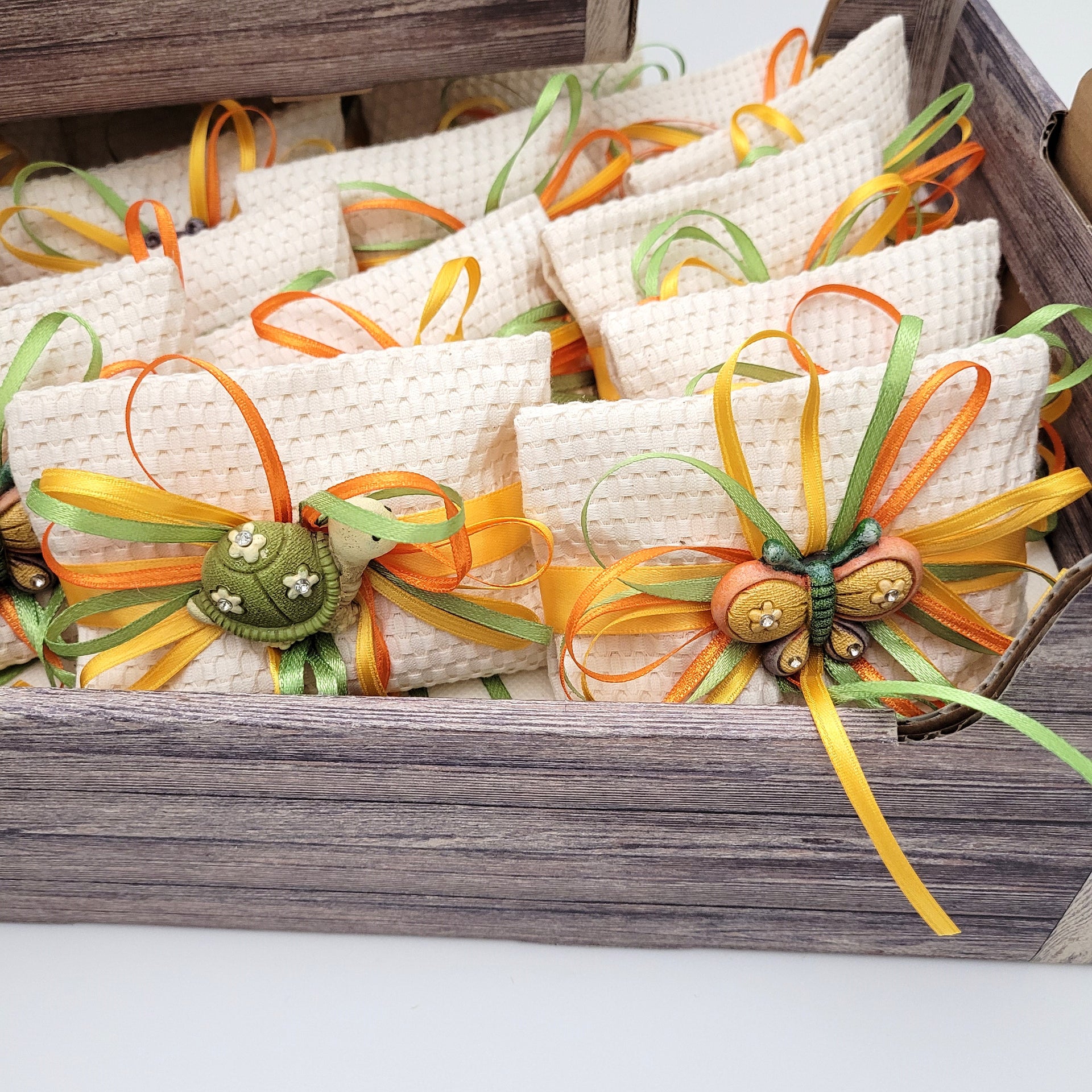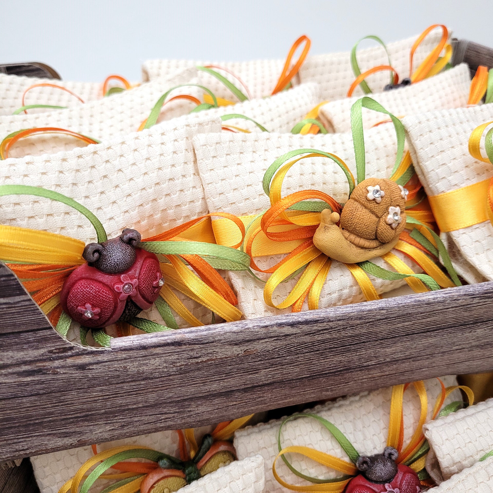 Le bustine sono decorate con nastri in doppio raso e magnete coccinella, farfalla, lumaca e tartaruga.