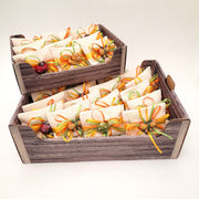 Espositore  a forma di cassettine sovrapposte, contenente 30 bustine porta confetti, lavorazione nido d'ape, complete di confetti e bigliettino stampato.
