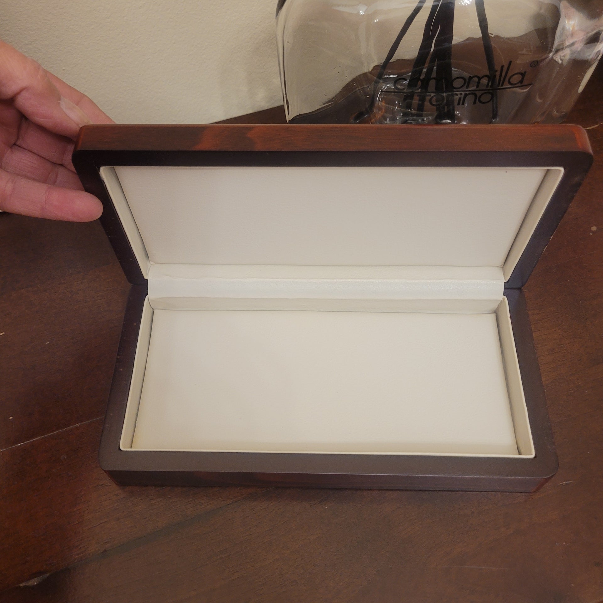 Cofanetto in legno marrone, internamente rivestito in pelle avorio.