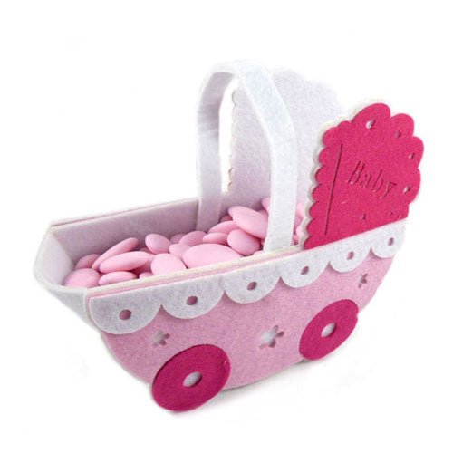 Cestino per confettata a forma di carrozzina in panno bianco e rosa.