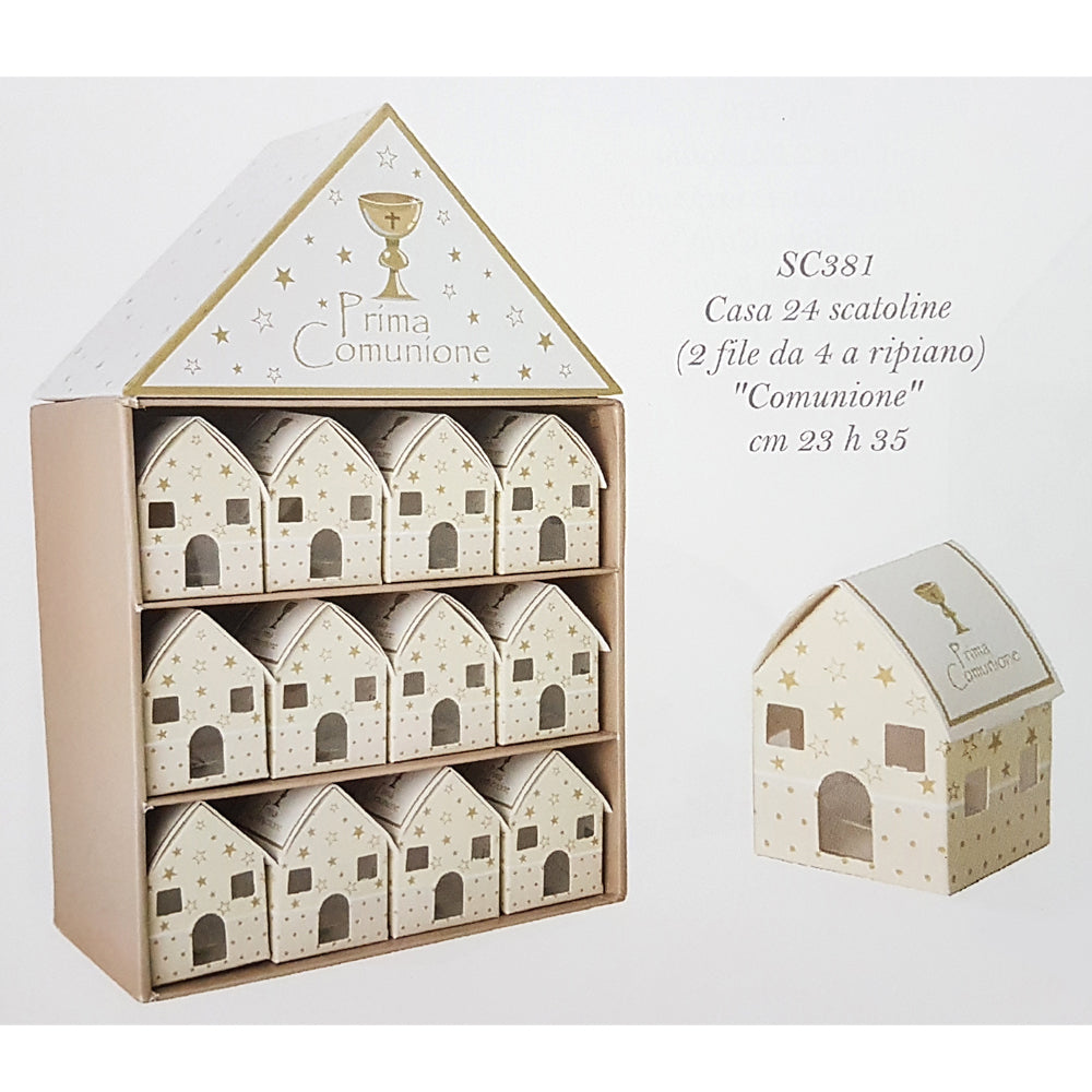 La casetta grande contiene 24 scatoline-casetta in cartoncino con scritta Prima Comunione, misura cm 5x5x7.