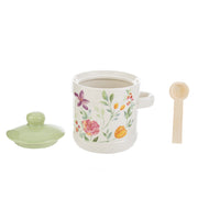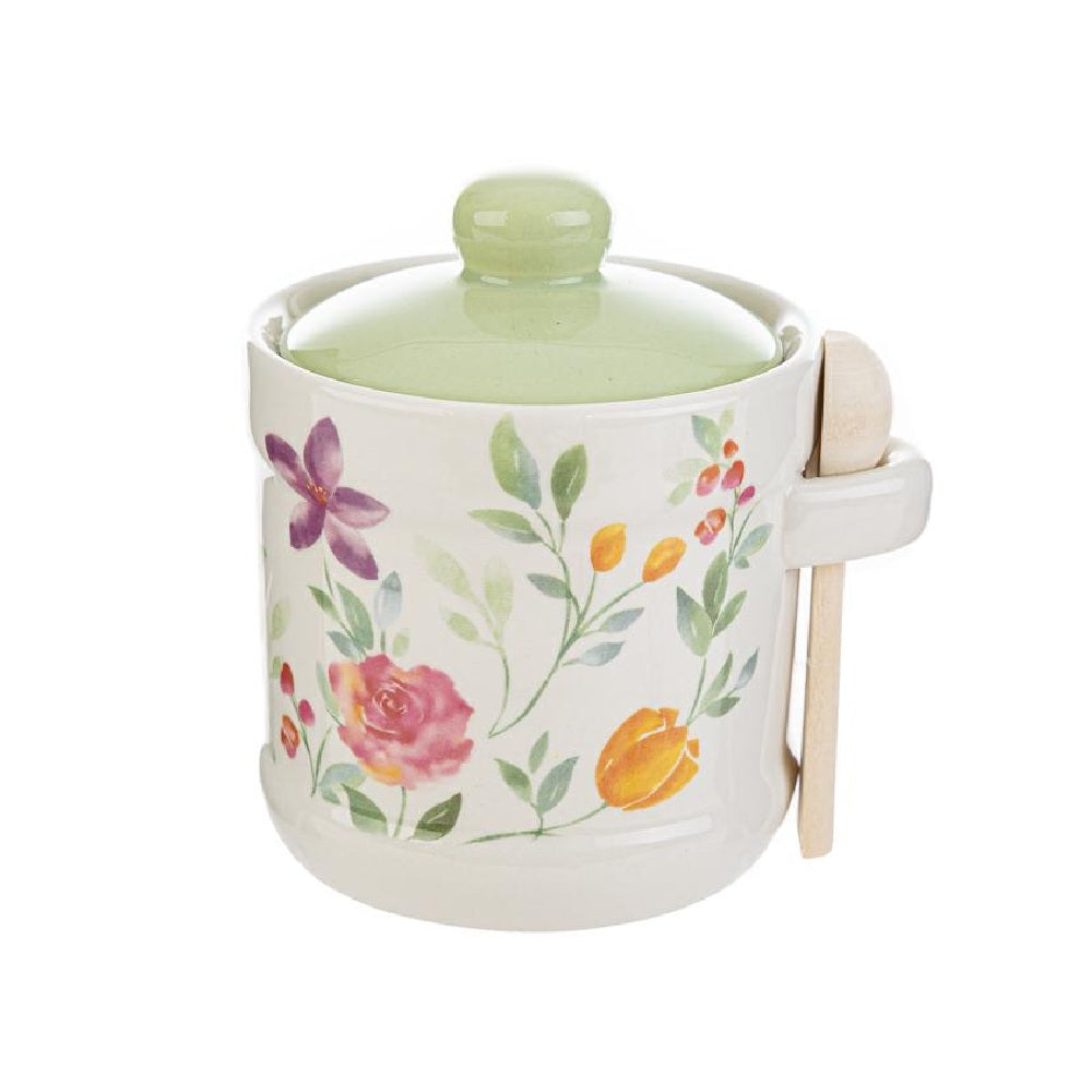 Zuccheriera in porcellana con cucchiaino e decorazione floreale