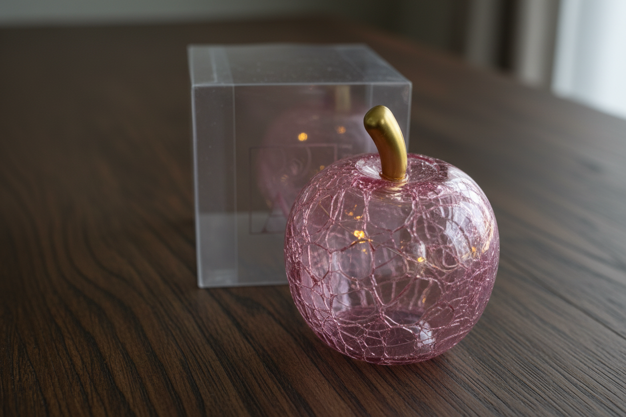 In vetro di colore rosa, la mela contiene un filo luminoso di luci calde a LED.