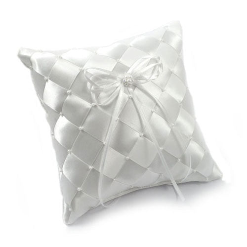 Cuscino per fedi quadrato bianco, decorato con intrecci di raso e perle.