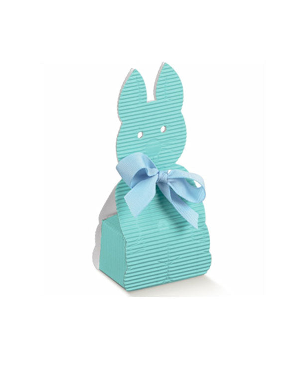Scatola porta confetti in cartoncino onda azzurro a forma di coniglio.