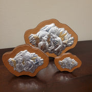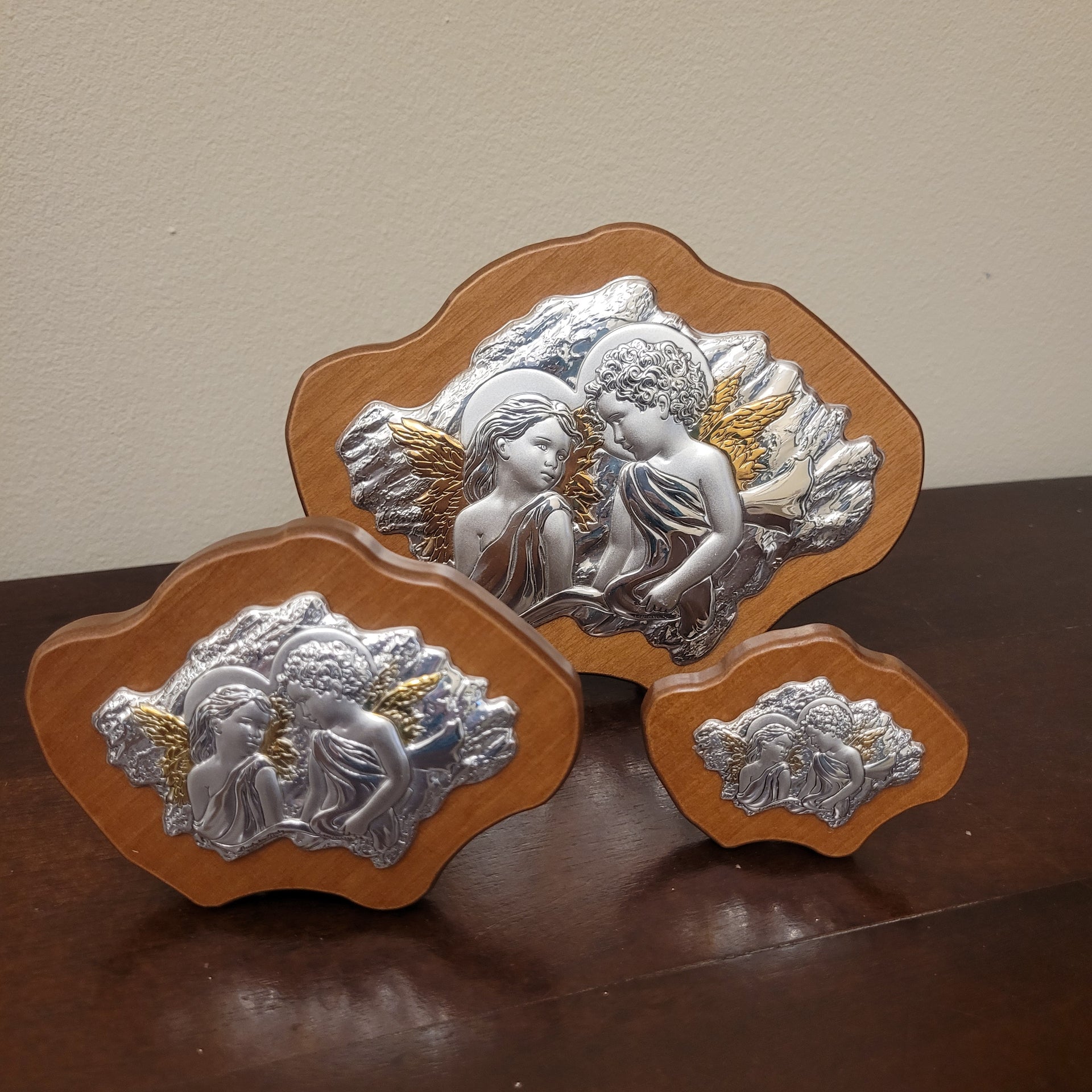 Tris di pannelli, in argento con base in pregiato legno e supposto per appoggio, raffiguranti gli "Angeli".