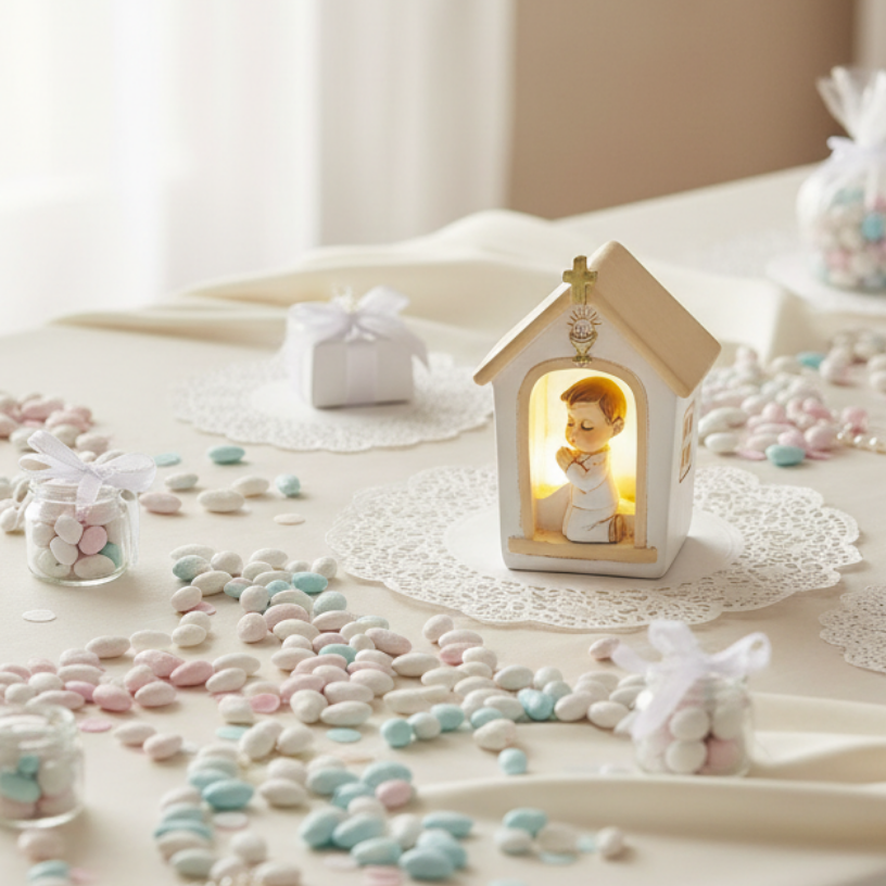 Bimbo in chiesa, in resina di qualità, con LED interno.