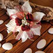 Coccarda porta confetti Micol panna con fiori bordeaux, bomboniera matrimonio