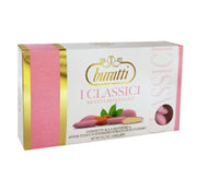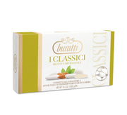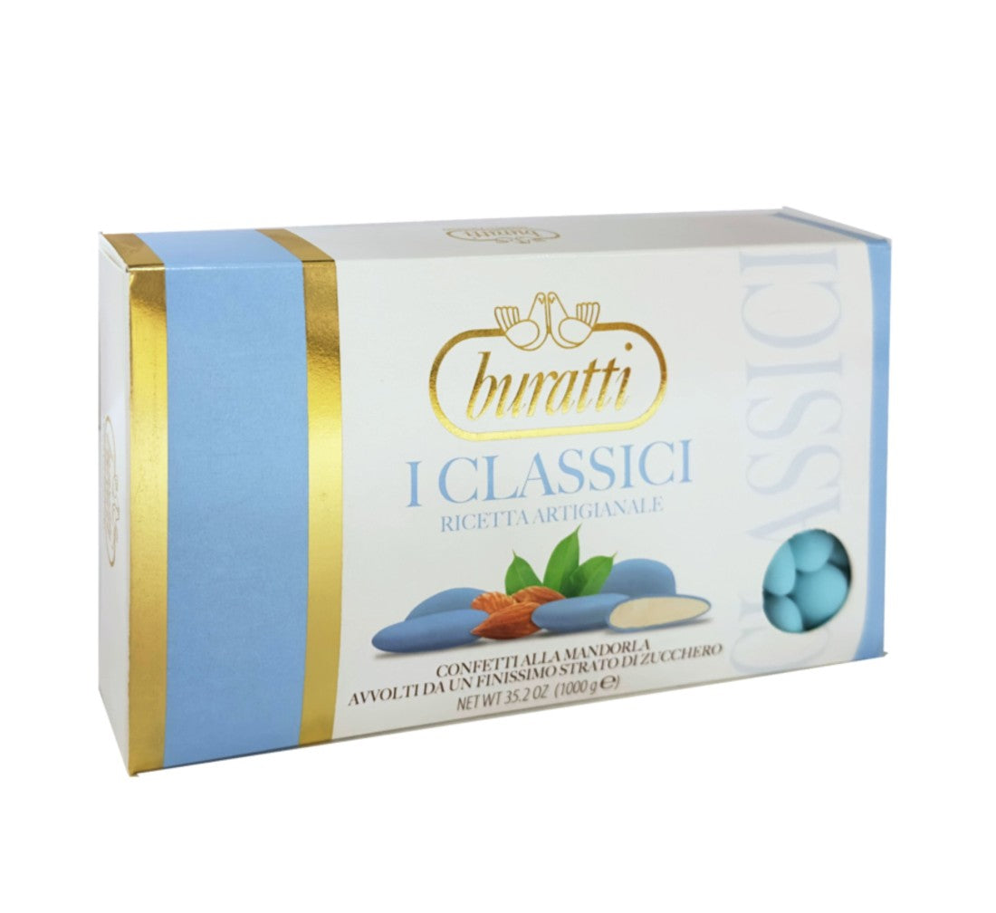 Confetti Buratti alla mandorla intera pelata ricoperti da un sottile strato di zucchero di colore bianco, rosa o azzurro .
